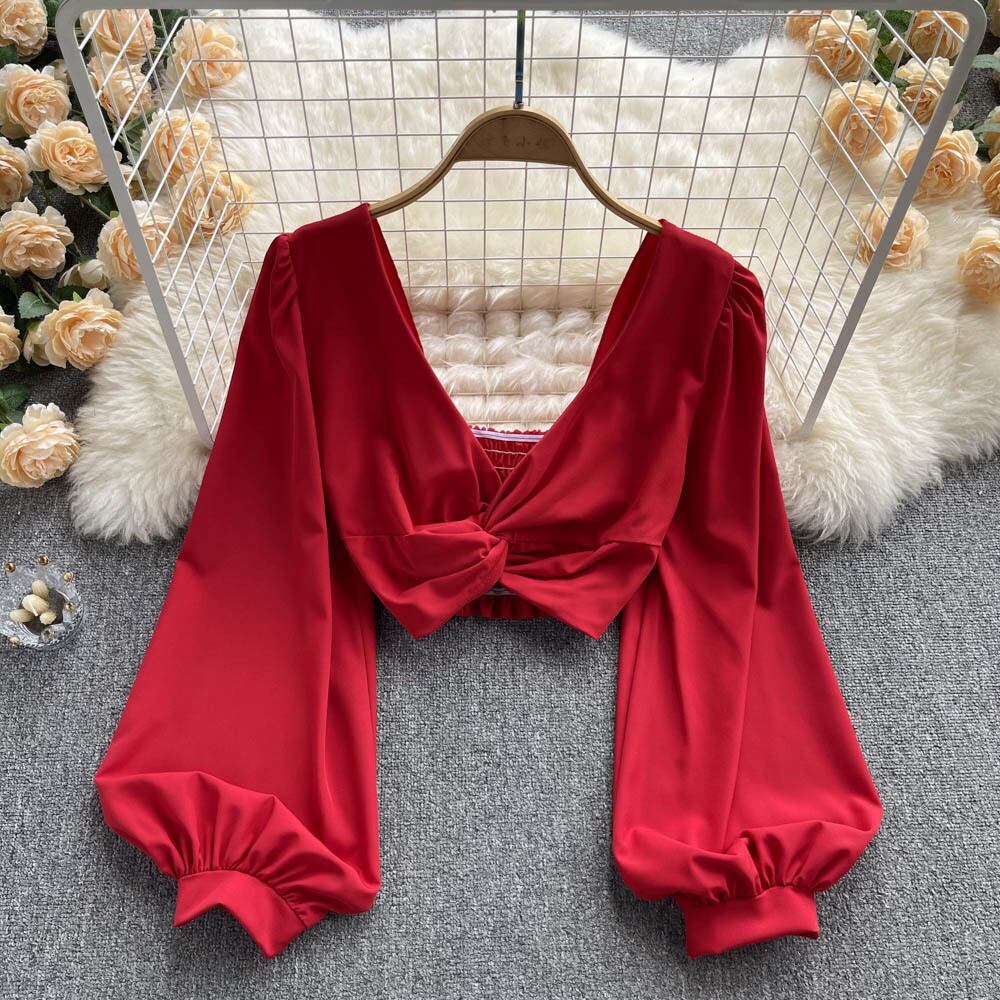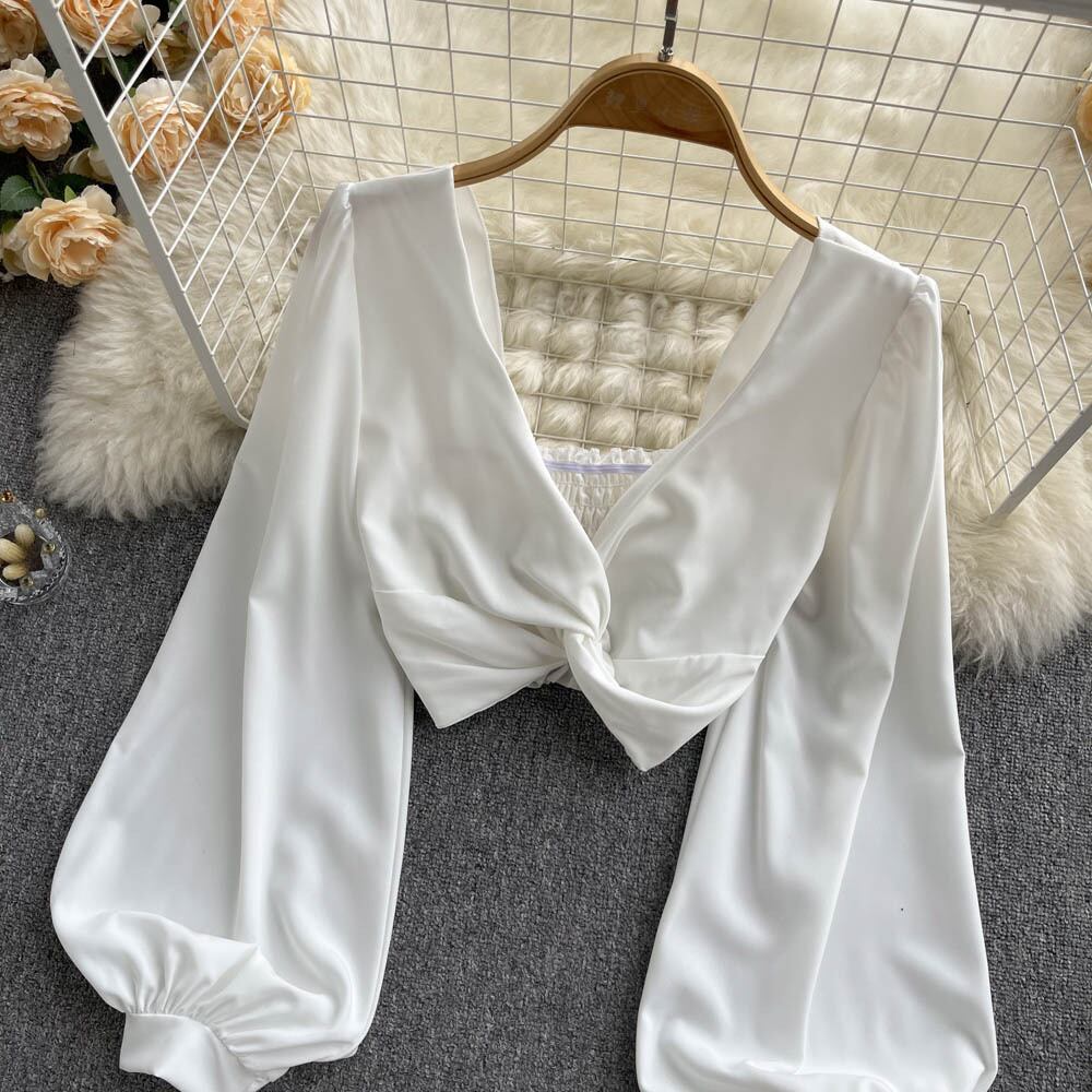 Spring and summer version of the new European and American style sexy deep V-neck kink bubble long-sleeved short belly button shirt top women ショート ロング スプリング 春物 サマー 夏物 Vネック ヨーロピアン lyxaj72041239244