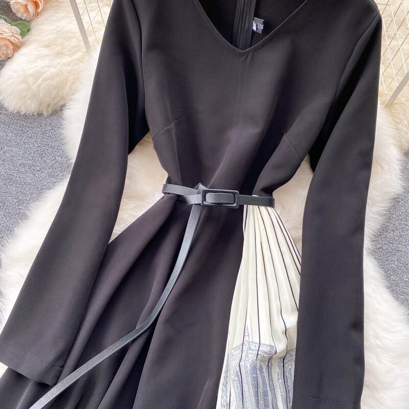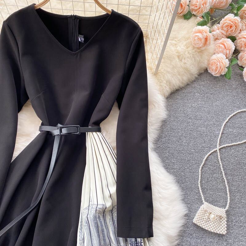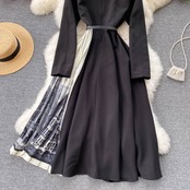 Dress women's 2021 autumn new European and American Hepburn style printed pleated belt waist and slim over the knee long skirt ロング プリント プリーツ オータム 秋物 ハーネス ベルト スカート スリム ヨーロピアン lyxaj37474325042
