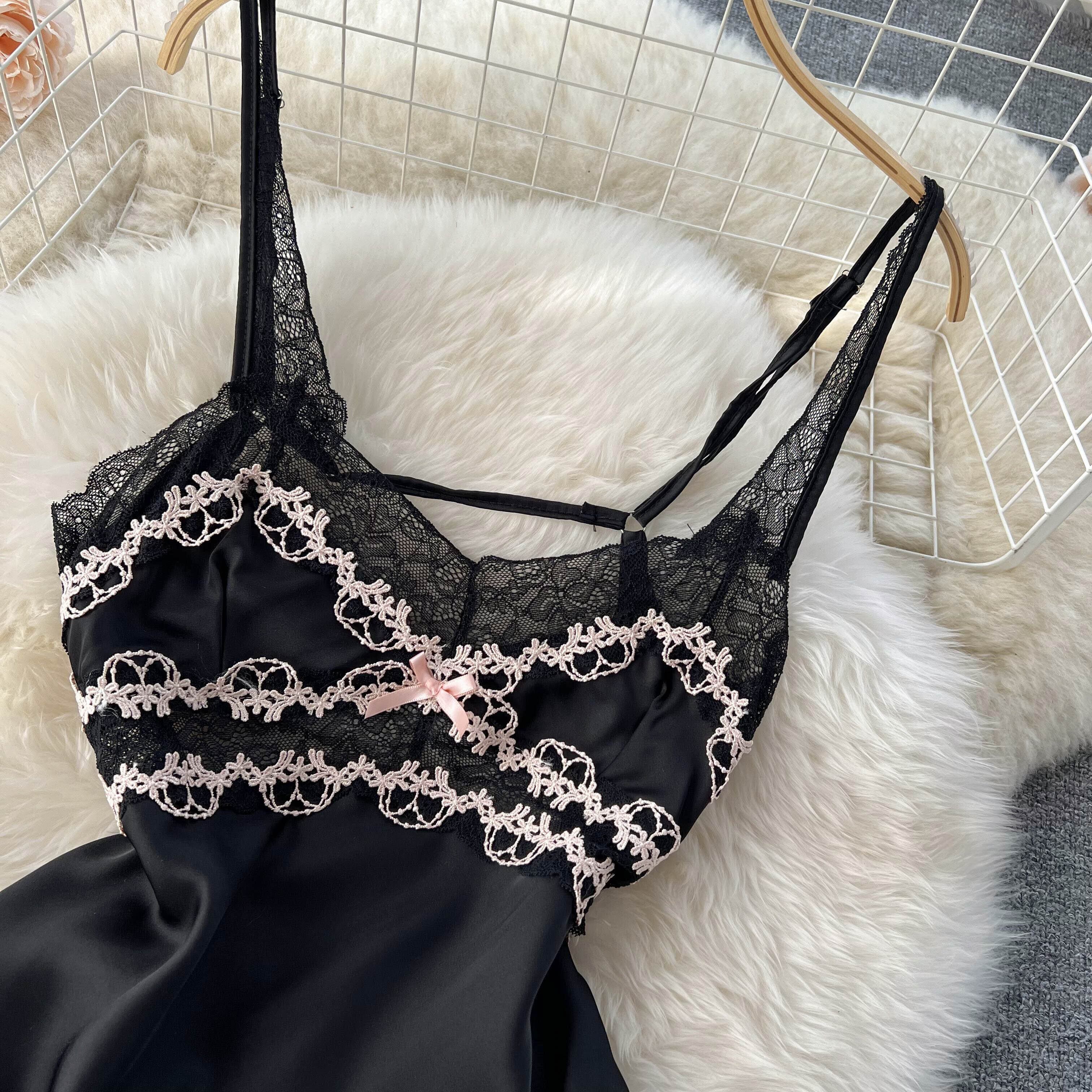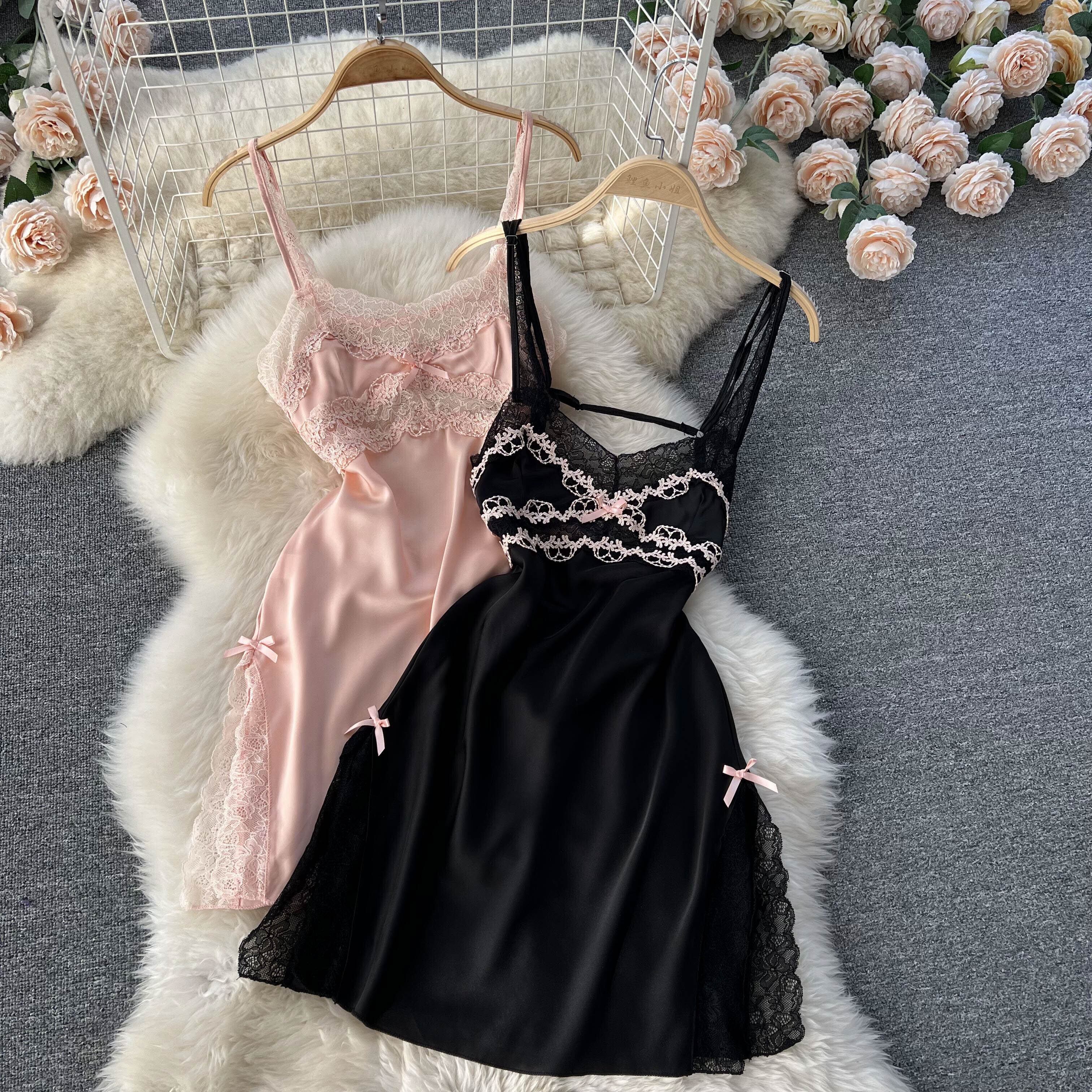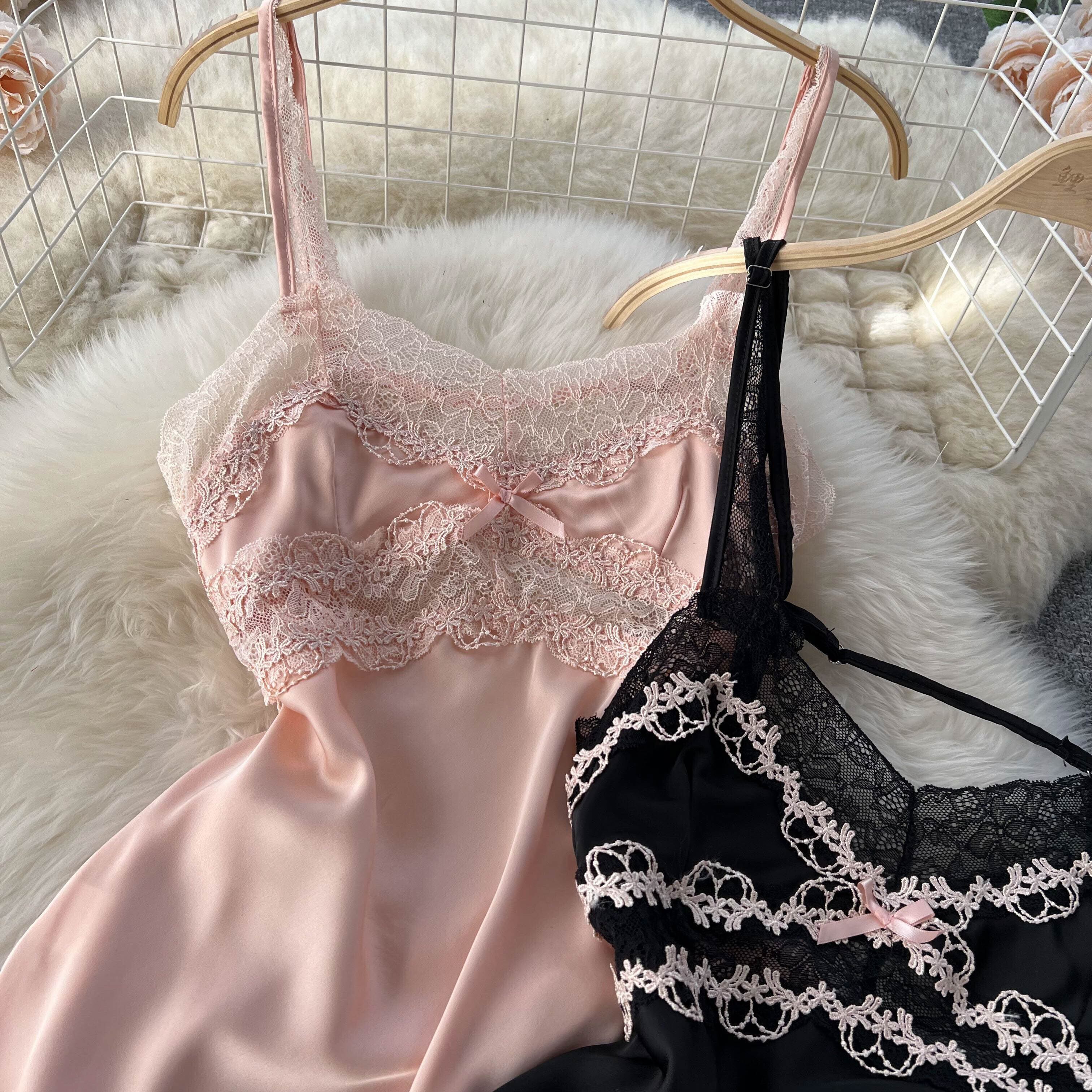 solid color sexy lace pajamas women's ice silk suspenders nightdress chest pad lace beautiful back temperament temptation home clothes レース シルク ソリッドカラー lyxaj17103845892