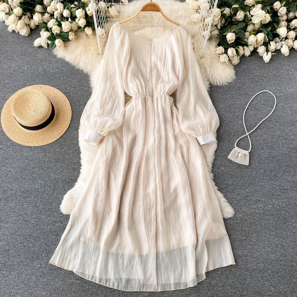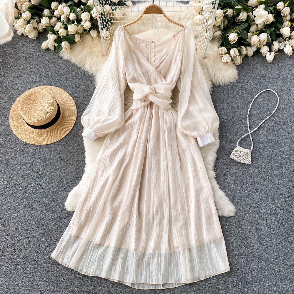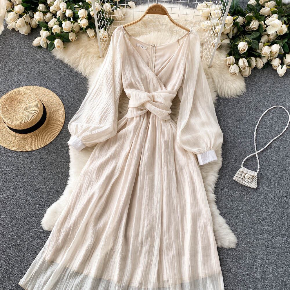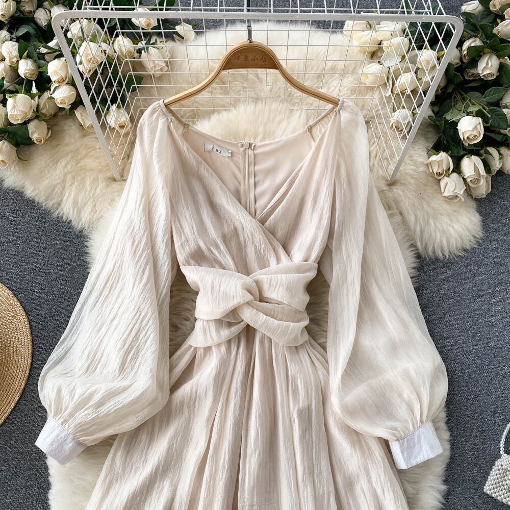 Gentle style V-neck French dress spring and autumn new style twisted waist lantern sleeves super fairy big swing long skirt ロング ランタンスリーブ スプリング 春物 オータム 秋物 スカート Vネック lyxaj54000142787