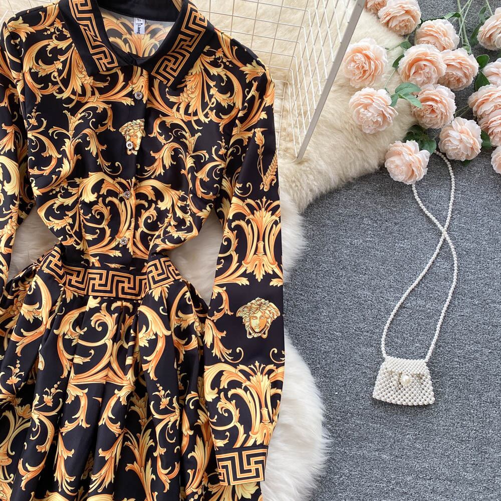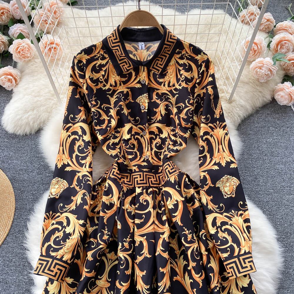 Luxury printed long-sleeved dress women's 2021 new European and American fashion retro trend waist long shirt skirt ロング レトロ プリント スカート ヨーロピアン lyxaj90182740812