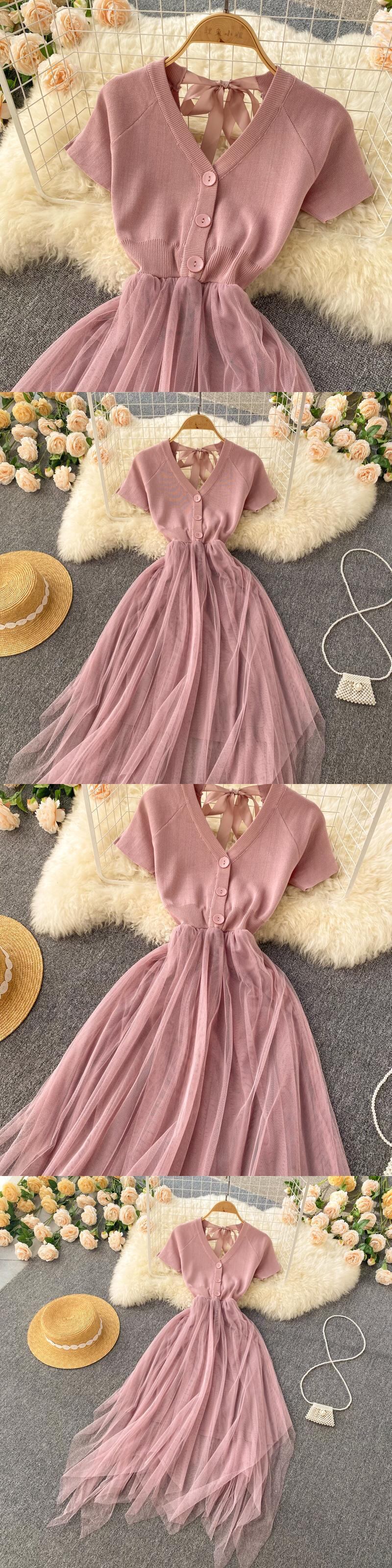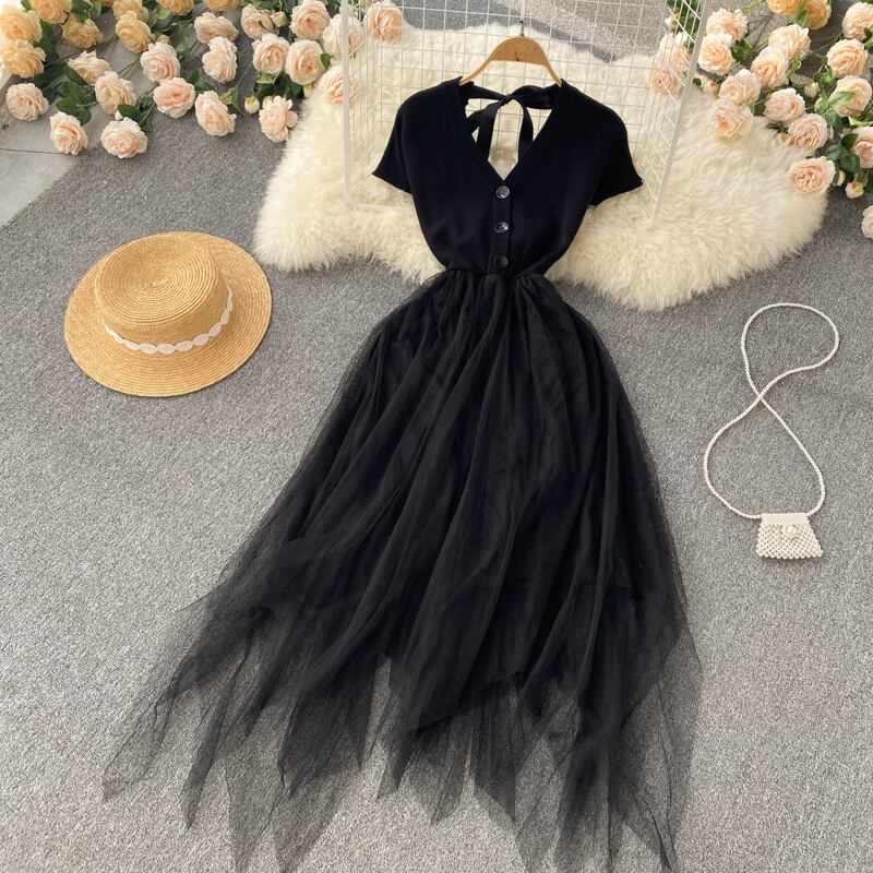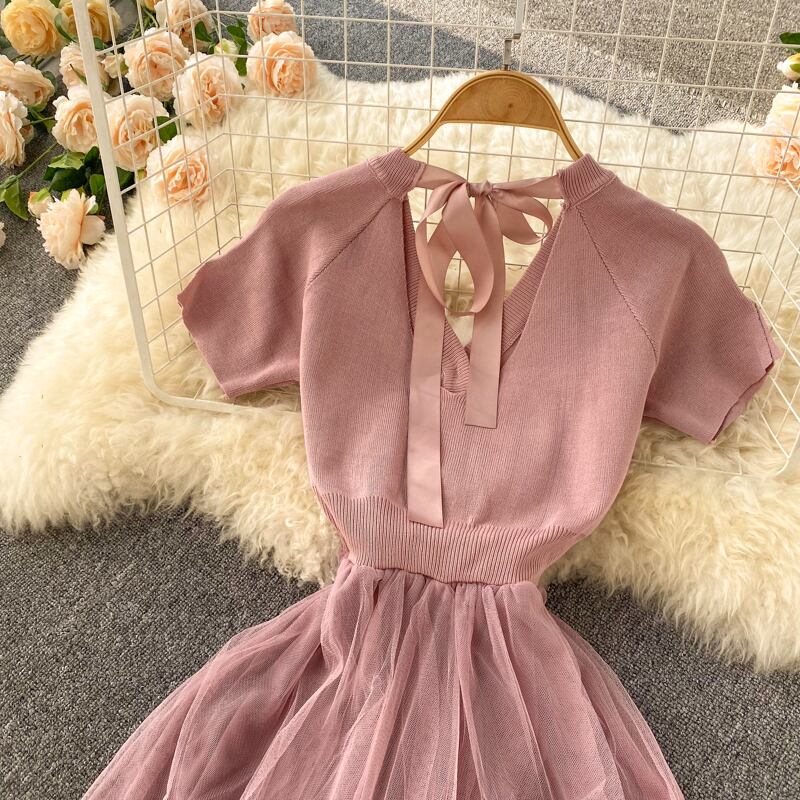 Mesh stitching knitted V-neck temperament dress female spring bellflower French super fairy irregular short-sleeved a-line skirt スプリング 春物 メッシュ スカート Vネック Aライン フラワーデザイン ステッチ lyxaj36441178335