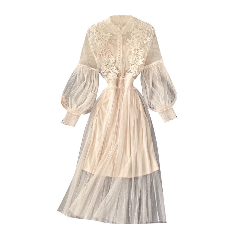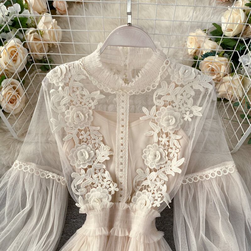 chic gentle wind dress 2020 new autumn design three-dimensional flower puff sleeve mesh fairy dress オータム 秋物 メッシュ フラワーデザイン lyxaj7306447454