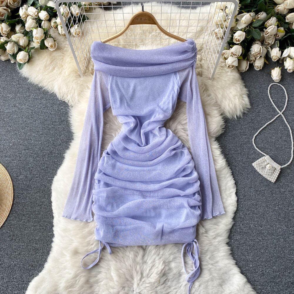 2022 spring and autumn sexy one-word collar long-sleeved drawstring pleated dress women's sparkling mesh slim fit hip skirt ロング プリーツ スプリング 春物 オータム 秋物 メッシュ スカート スリム lyxaj7679891492