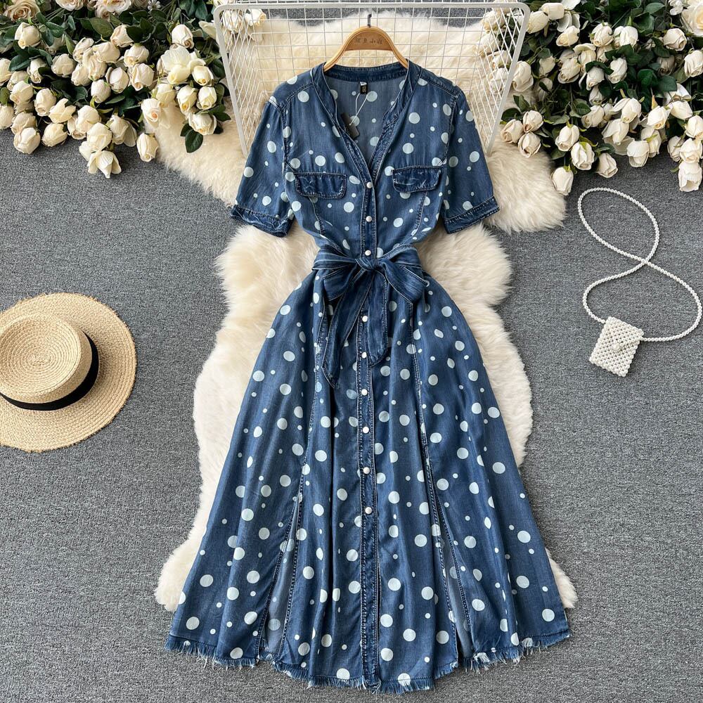 European and American ins2022 summer new polka dot Tencel denim dress female V-neck waist tie over the knee long skirt ロング サマー 夏物 スカート Vネック ヨーロピアン lyxaj93865901091