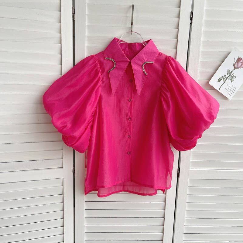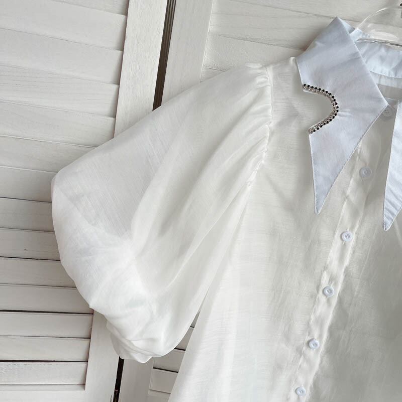 European and American ins tops women's design sense niche diamond-studded lapel slim short lantern sleeves loose all-match shirt women ショート ランタンスリーブ スリム ヨーロピアン lyxaj32430793868