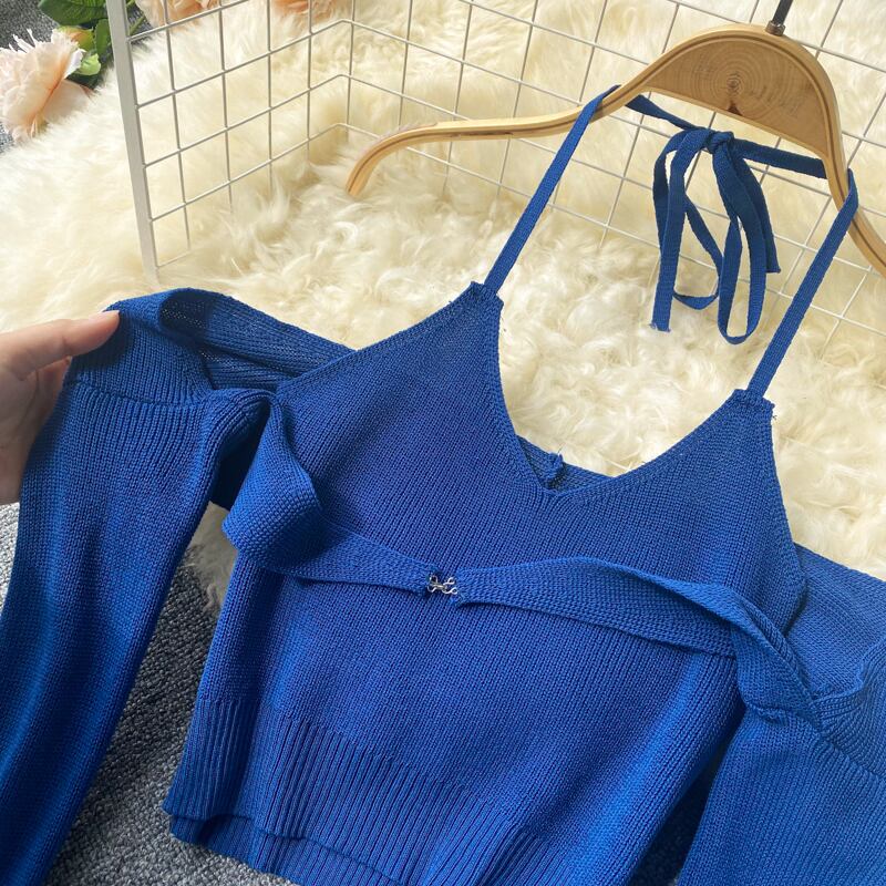2022 summer new design sense of niche halter neck flared sleeve knitted sweater with a slim fit and a versatile top レッド サマー 夏物 スリム lyxaj58682081318