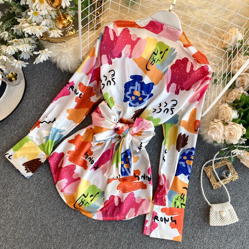 Celebrity temperament shirt women's design sense niche bandage waist thin irregular tie-dye satin shirt trendy top サテン lyxaj9513078221