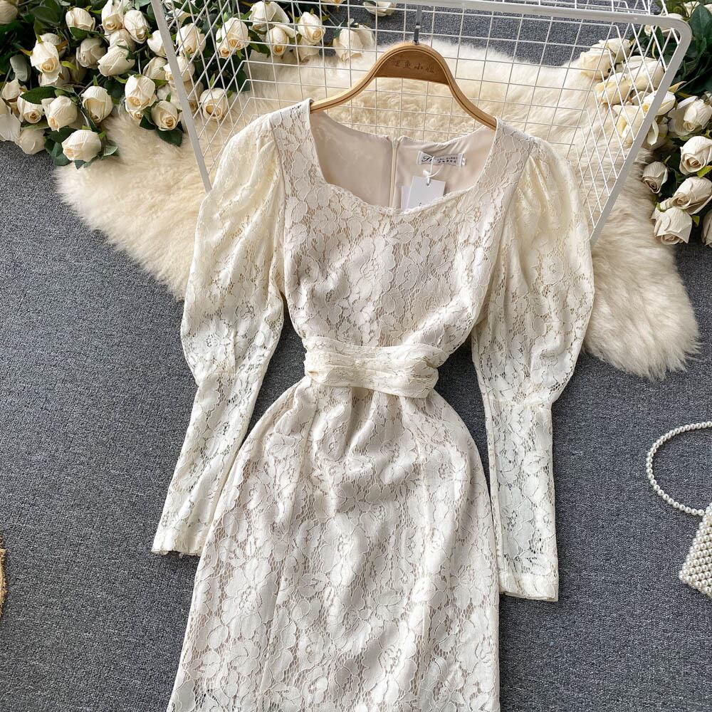 Feminine dress design sense niche lamb leg sleeves straps waist slim sexy lace fishtail skirt dress women レース スカート スリム lyxaj95446843465