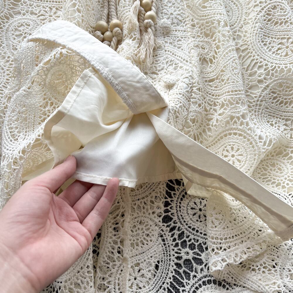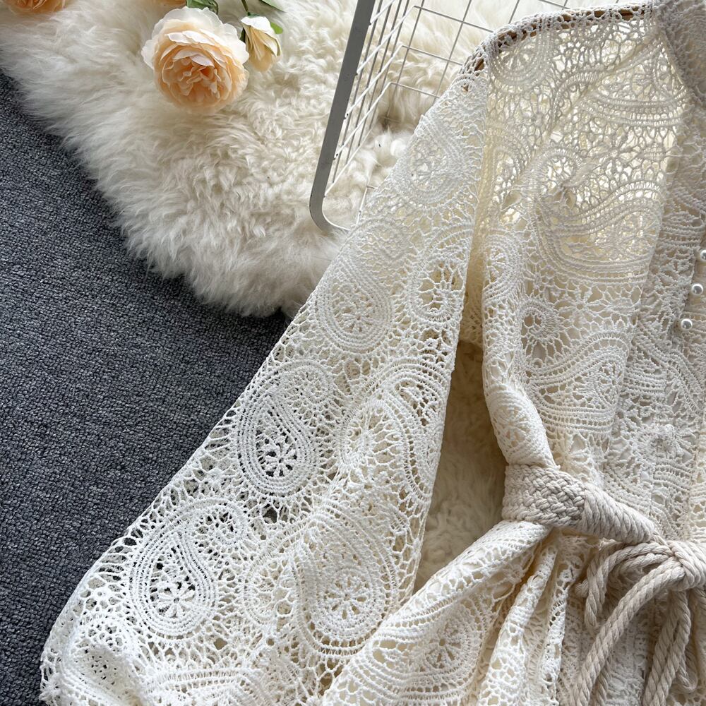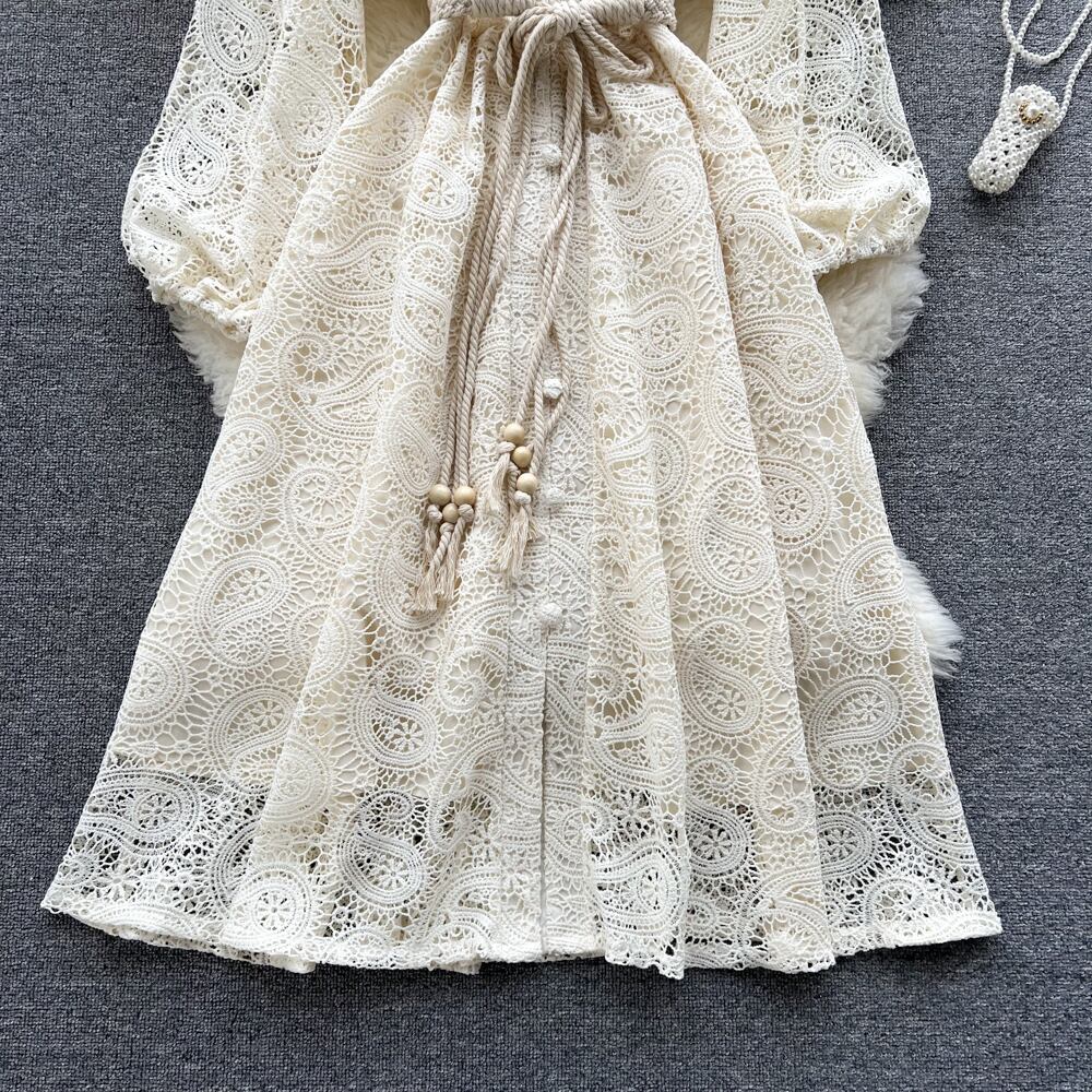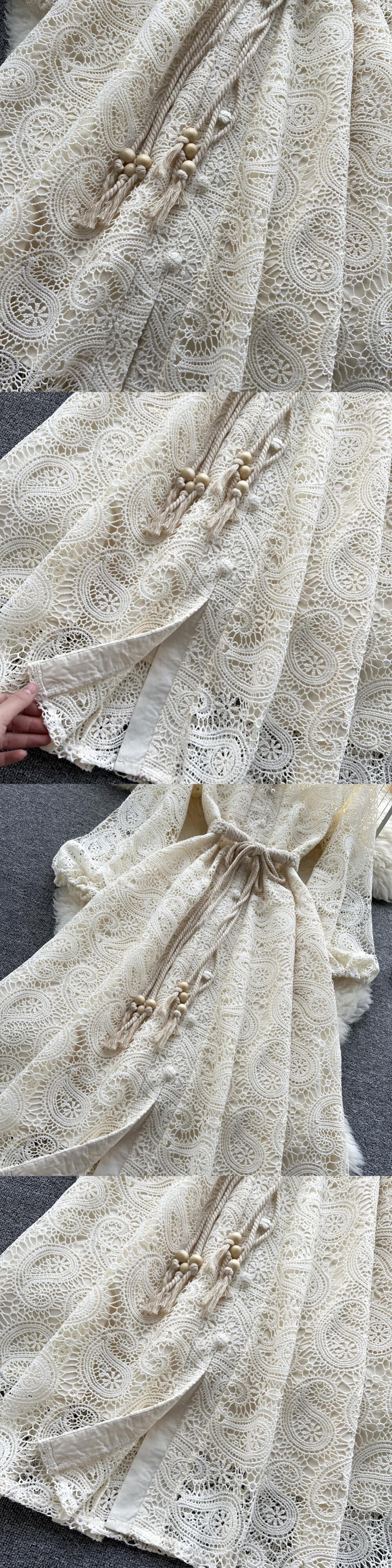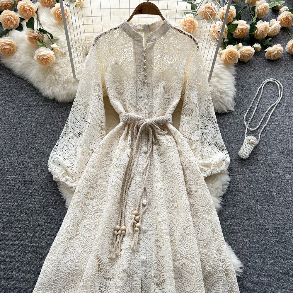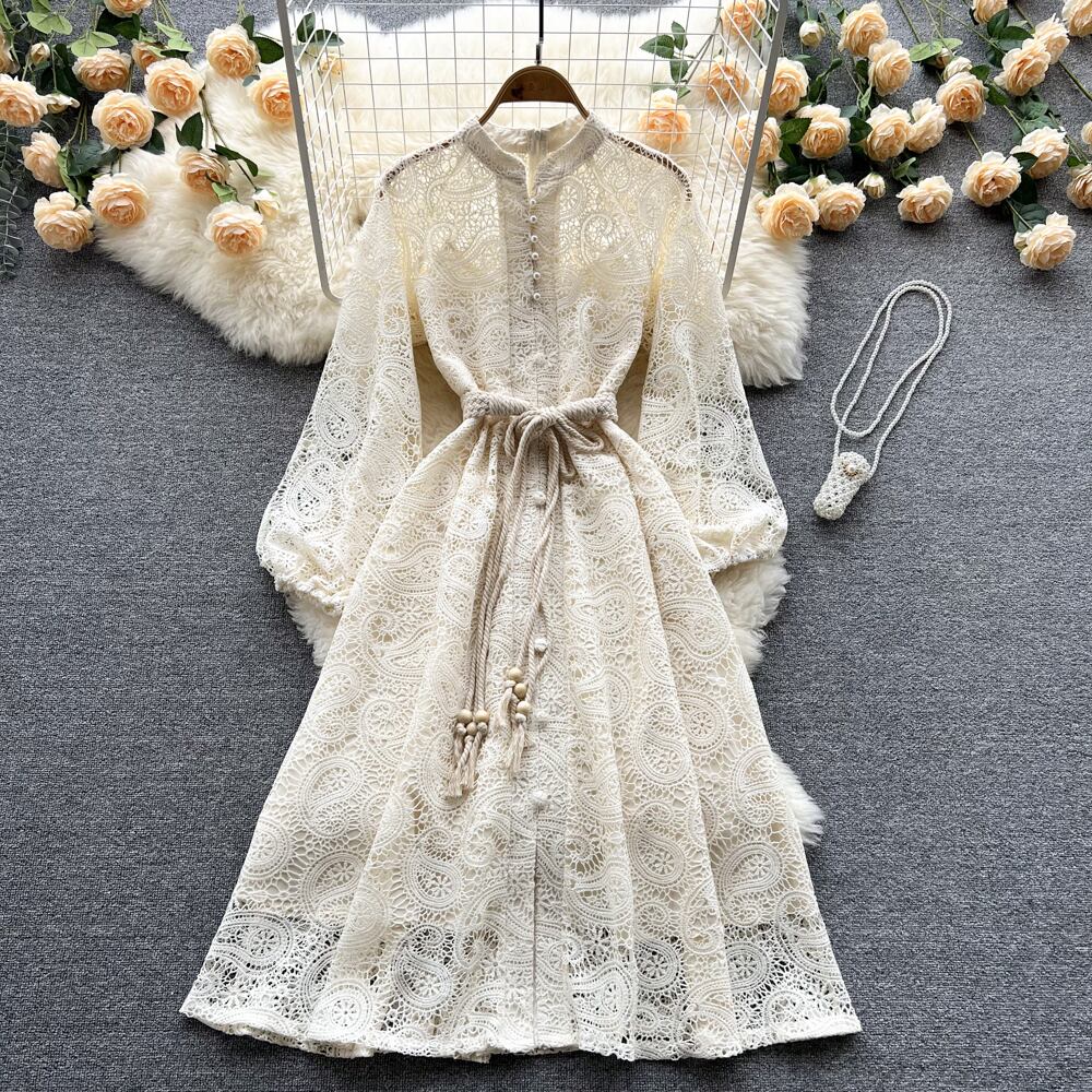 Court style French retro fairy skirt stand collar buttoned temperament waist slim lace dress knee length skirt レトロ レース スカート スリム lyxaj44891622693