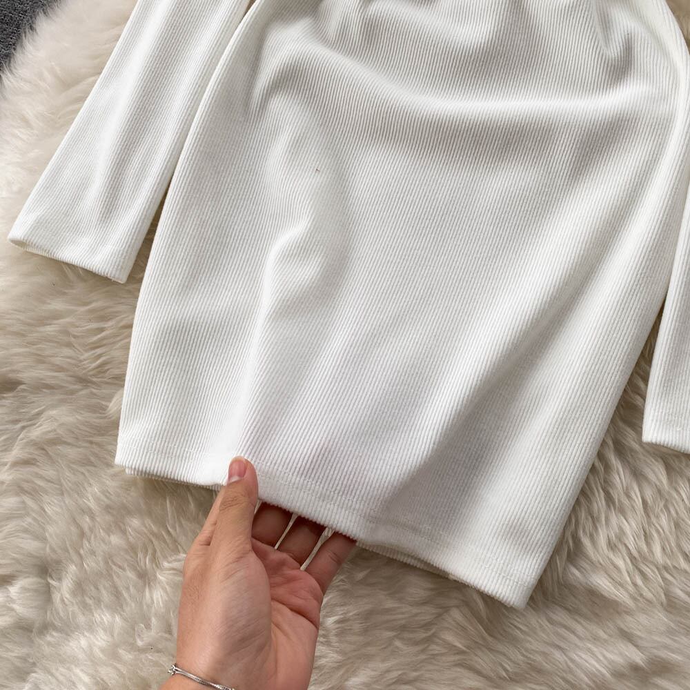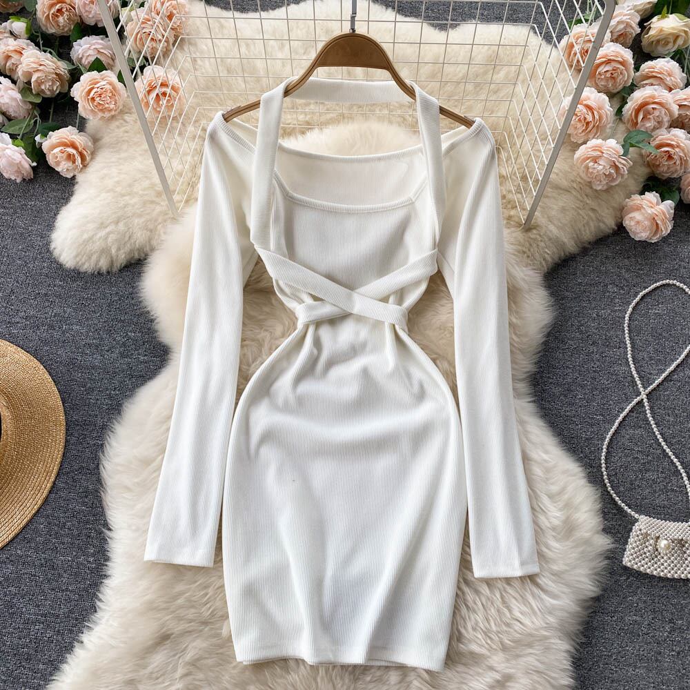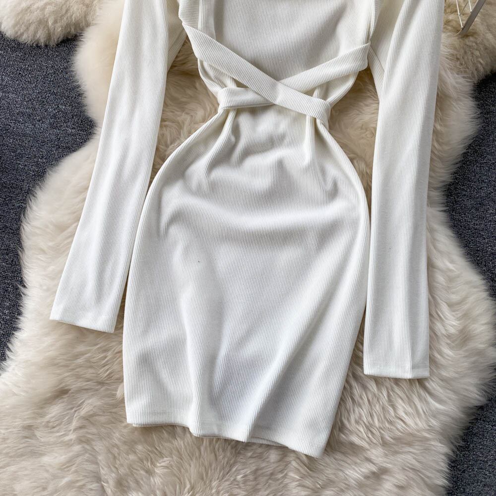 Sweet and spicy windy cross straps temperament hanging neck showing chest slim long-sleeved dress female small bag hip skirt ロング 大人ガーリー スウィート キュート カジュアル スカート スリム lyxaj48011507023