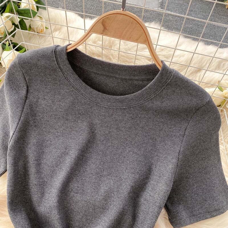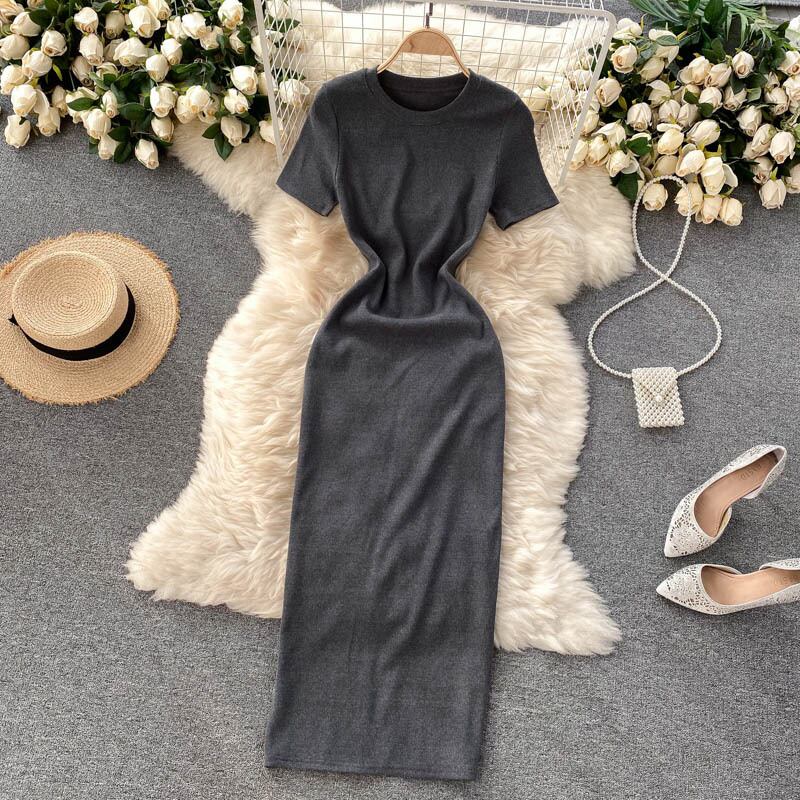 Short-sleeved women's summer 2021 new simple solid color temperament round neck self-cultivation mid-length scheming slit dress women サマー 夏物 Oネック ソリッドカラー lyxaj99330344662