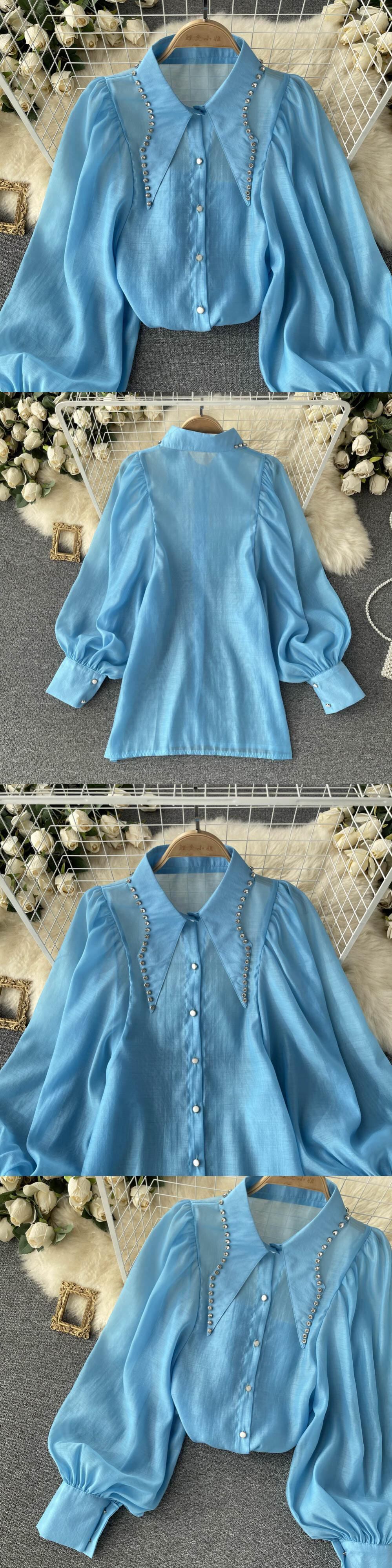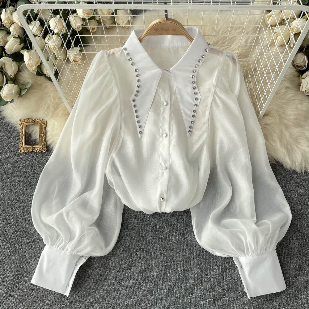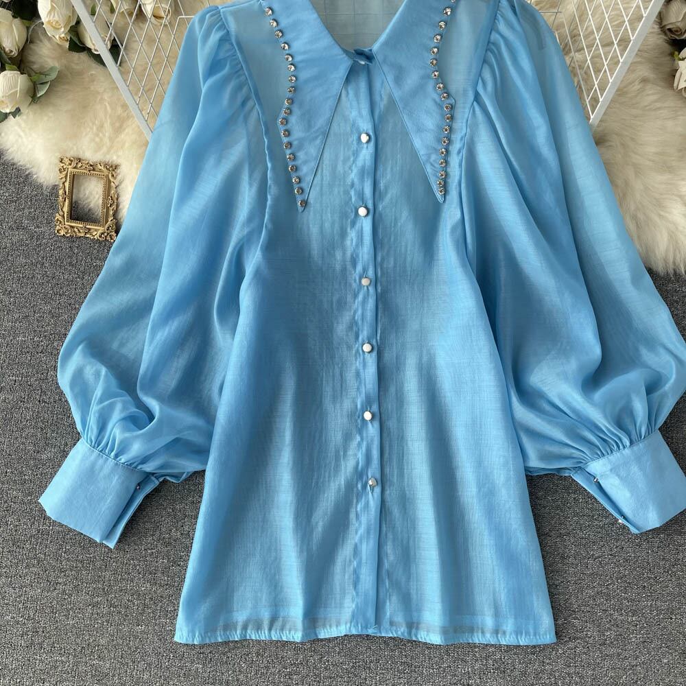 French retro temperament diamond-studded shirt women's design niche loose fashion eign style bubble long-sleeved lapel top ロング レトロ lyxaj71586070721