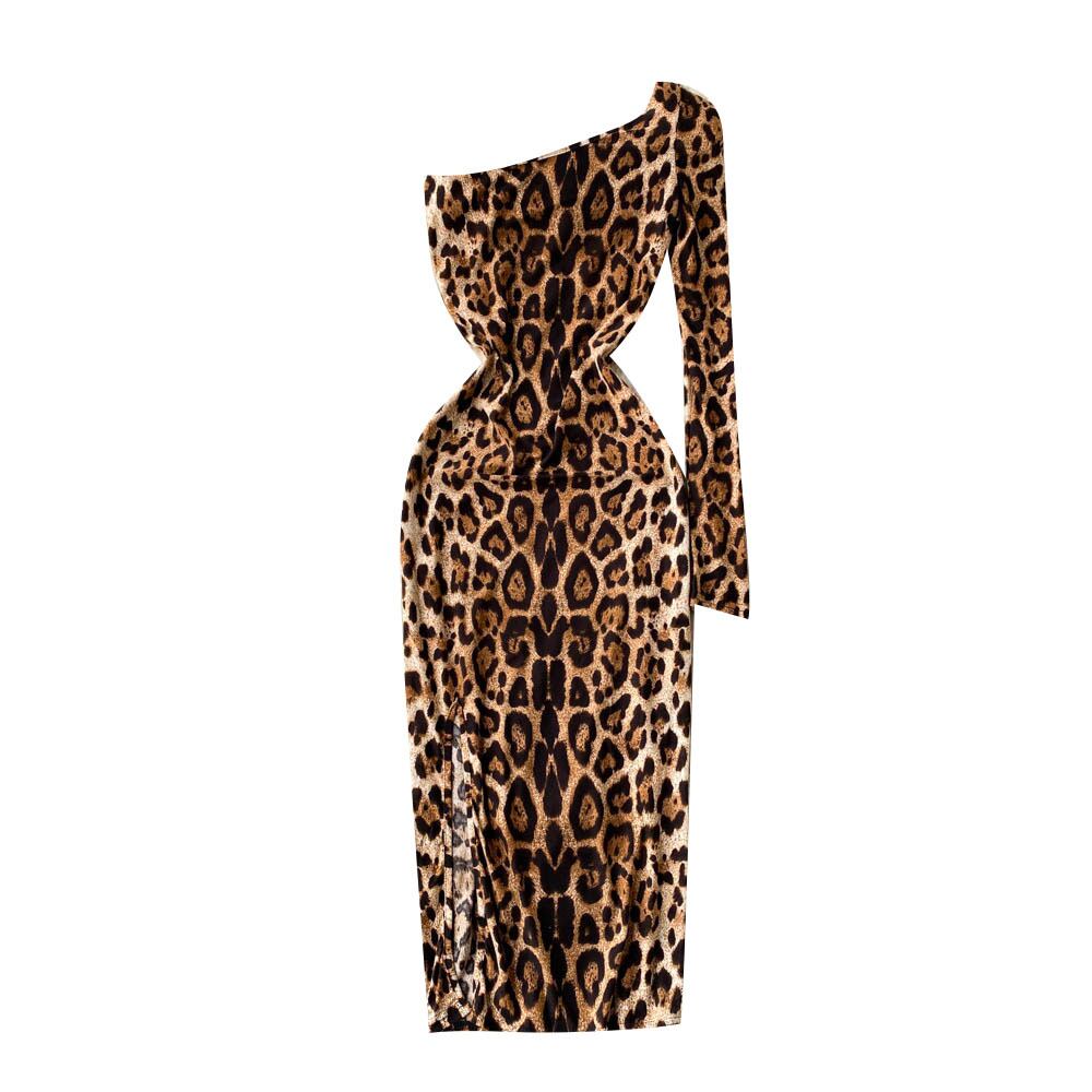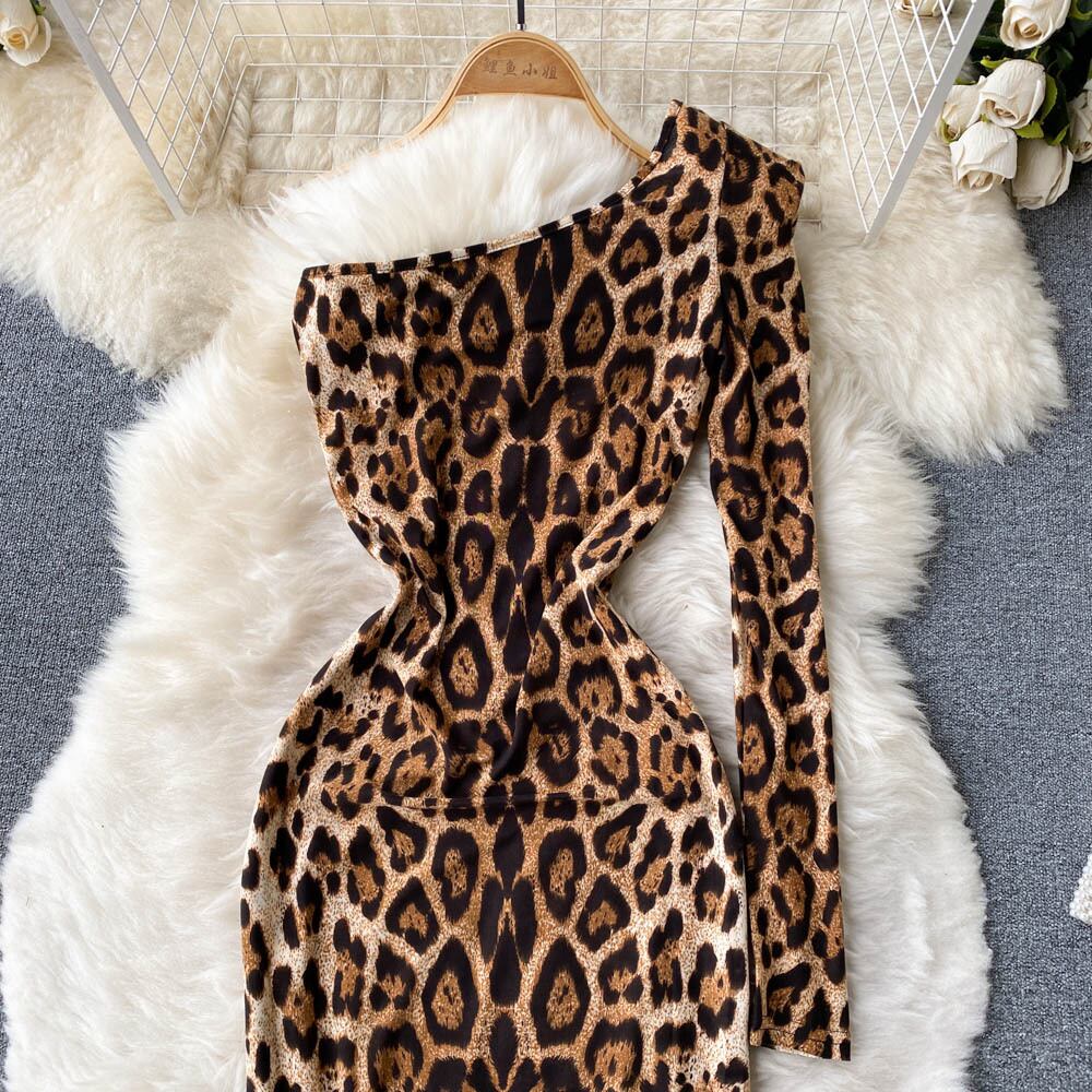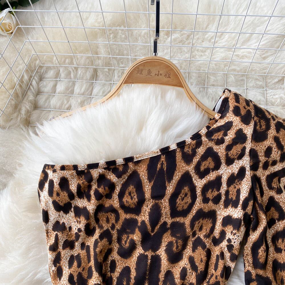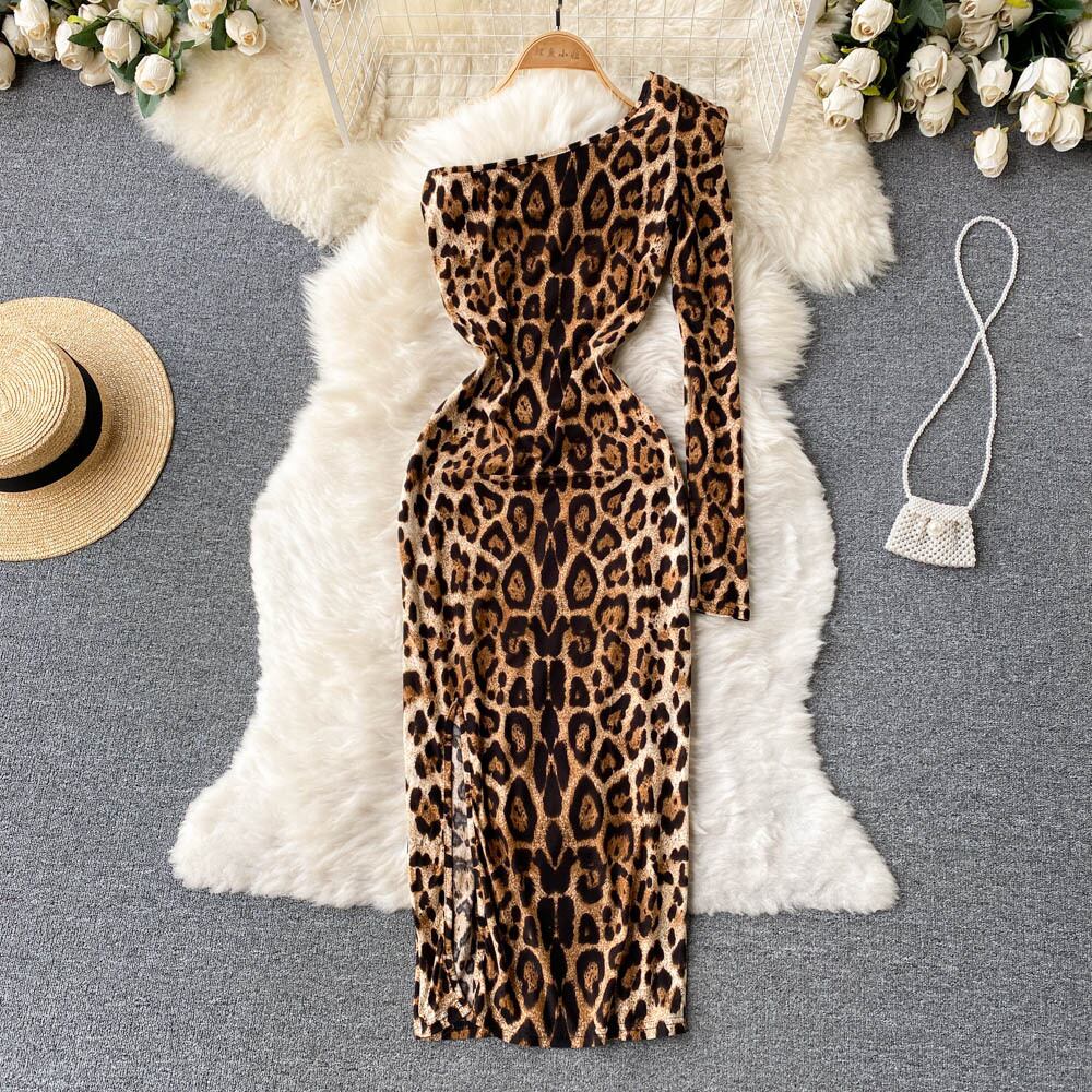 Leopard print waist dress shows thin temperament V-neck long-sleeved high-waisted hips feminine one-piece slim knitted dress ロング Vネック スリム lyxaj49610020991