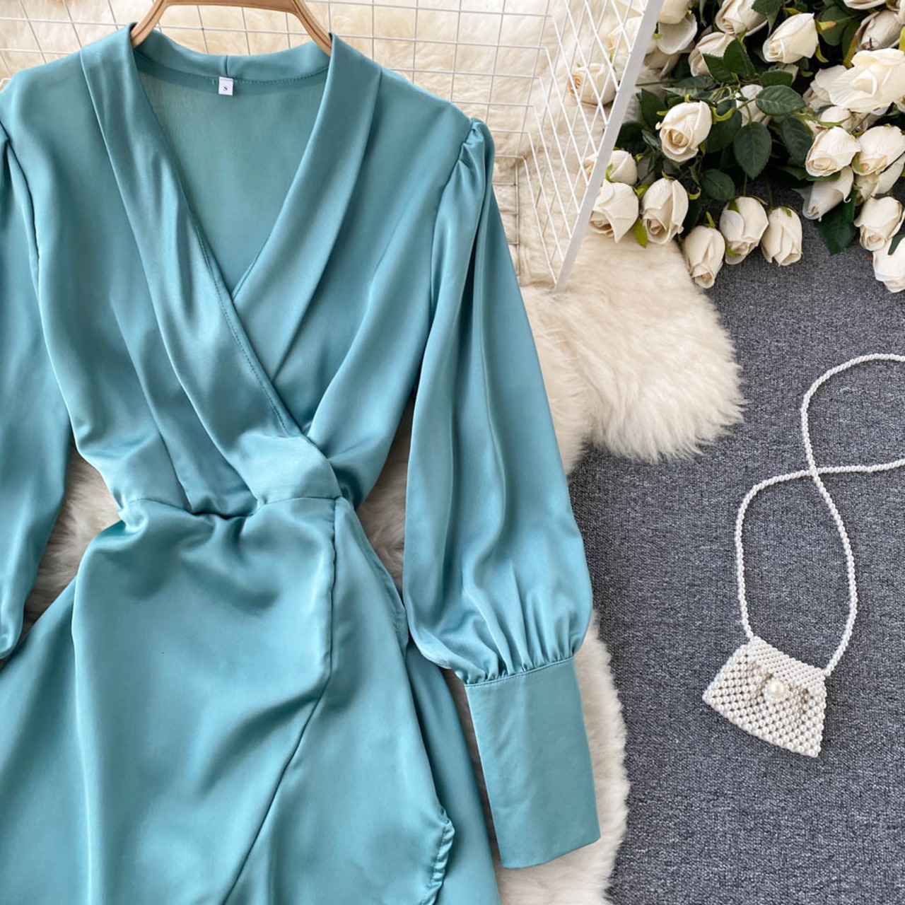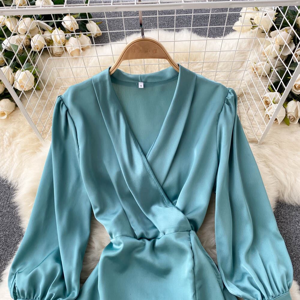French temperament V-neck chic design sense niche waist slim bubble long-sleeved irregular ruffle dress ロング Vネック スリム lyxaj58889616418