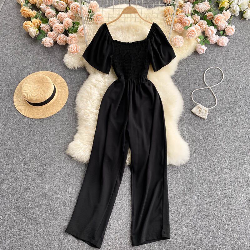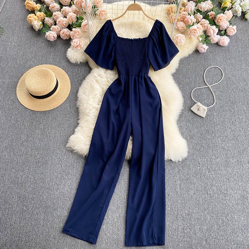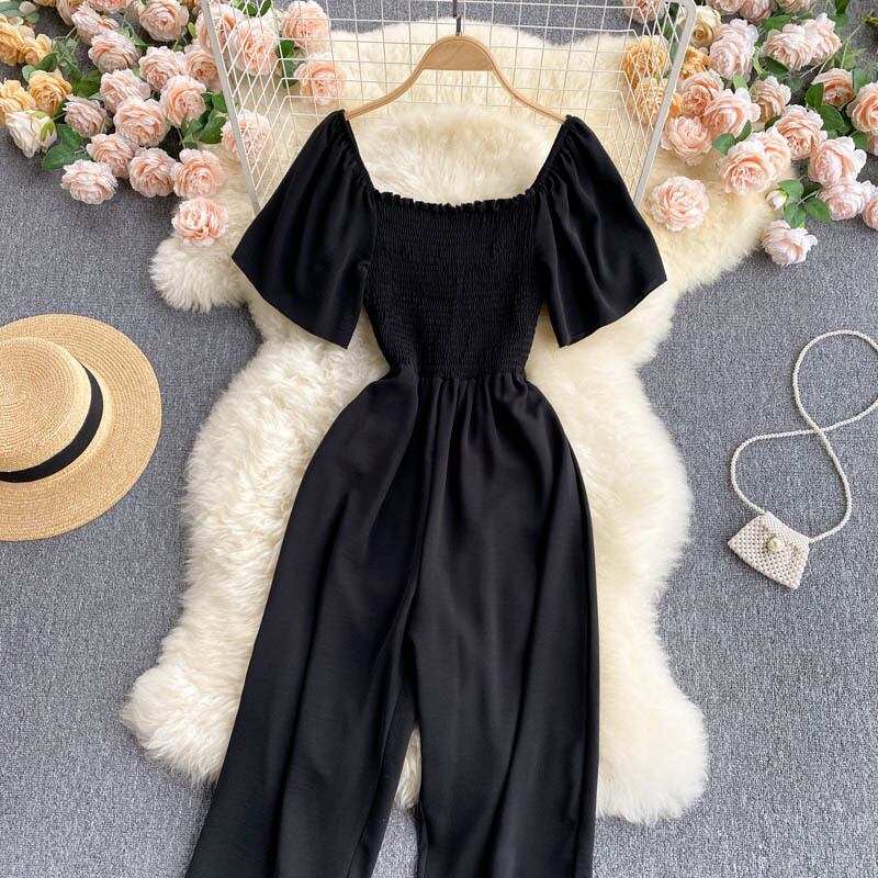 Light and mature women's clothing 2021 new trendy temperament square collar elastic waist waist shows thin long wide-leg pants jumpsuit women's summer ロング エラスティック 伸縮 サマー 夏物 スクウェア lyxaj3170331753