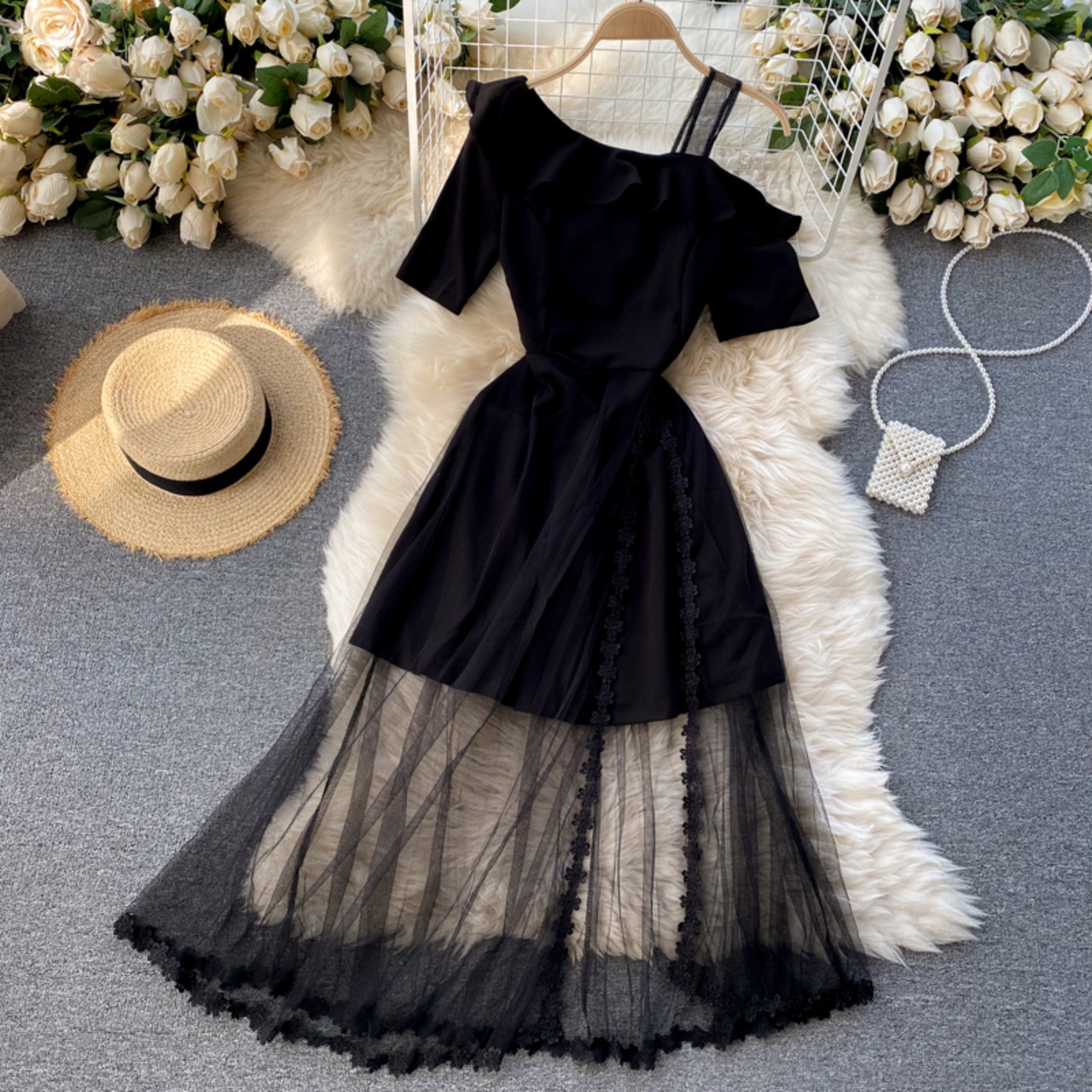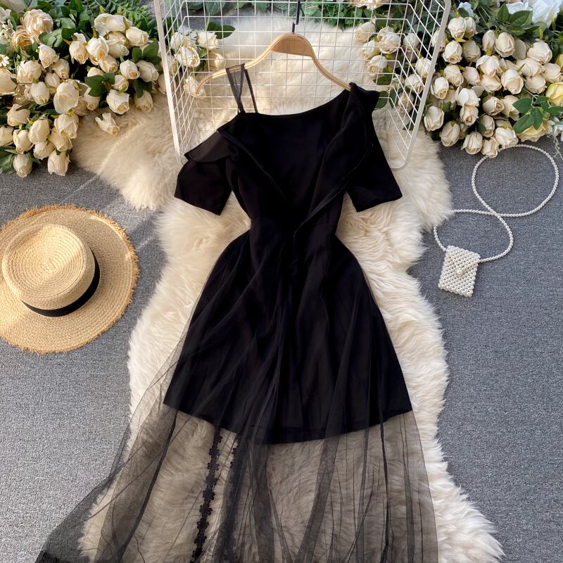 European and American ins Hepburn style dress one-shoulder sling short-sleeved fungus edge mesh stitching slit elegant fairy skirt エレガント メッシュ スカート ヨーロピアン ステッチ lyxaj53055244848