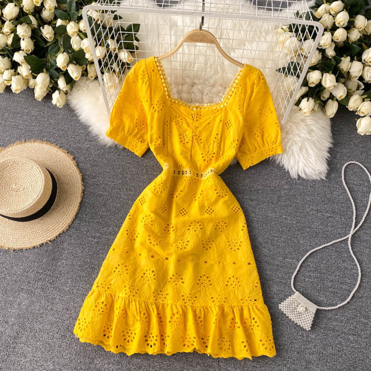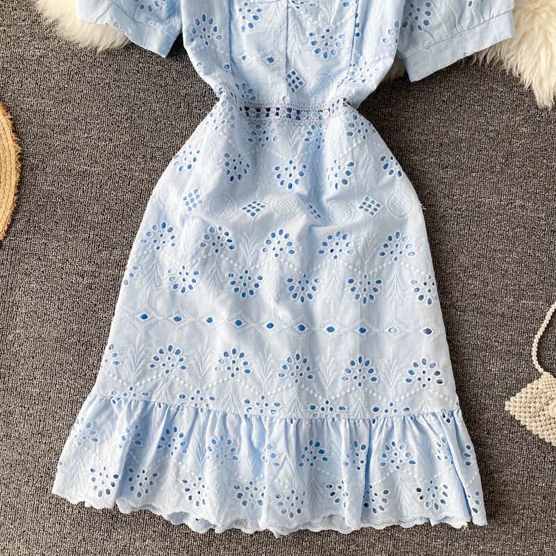 Summer dress 2021 new women's French age-reducing puff sleeves scheming hollow slim short ruffled sweet dress ショート 大人ガーリー スウィート キュート カジュアル サマー 夏物 スリム lyxaj94970596173