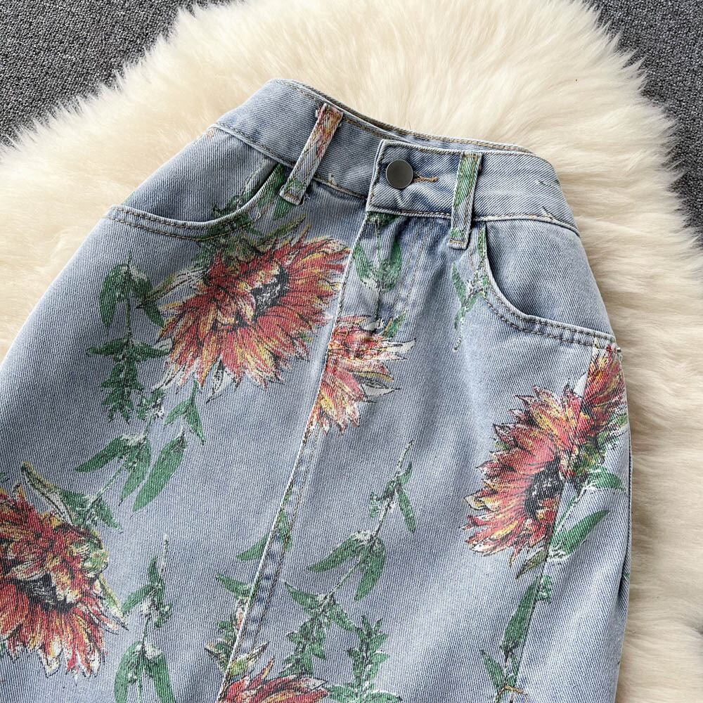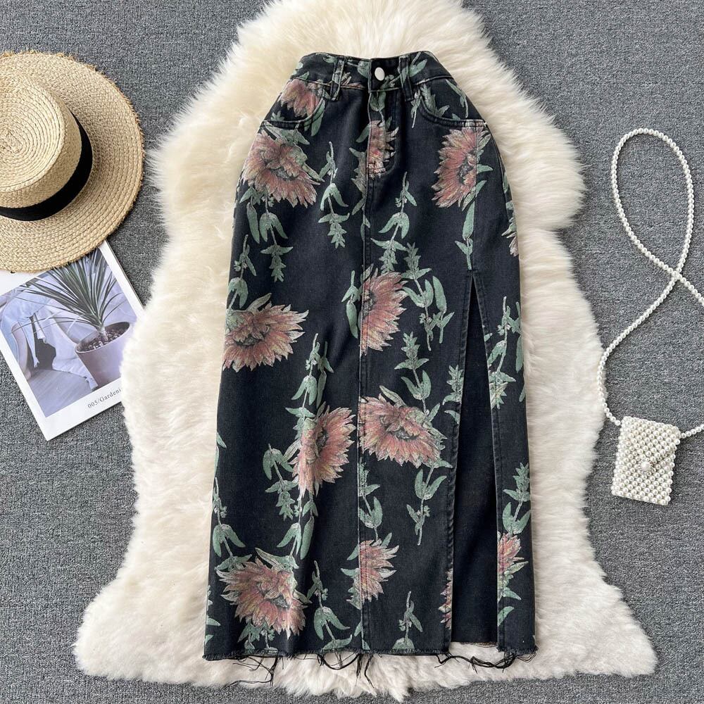 sense niche high waist slit printed denim skirt women's mid-length summer all-match loose a-line hip skirt ハイウェスト プリント サマー 夏物 スカート Aライン lyxaj81456916373