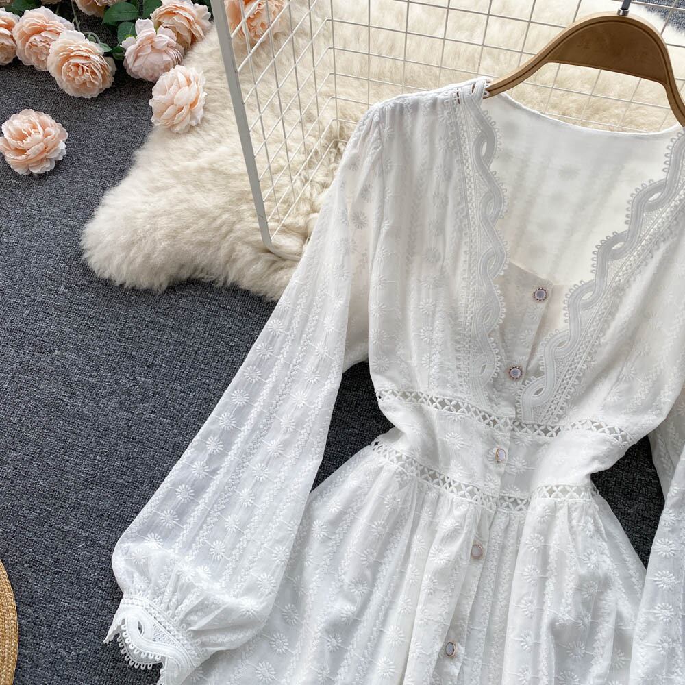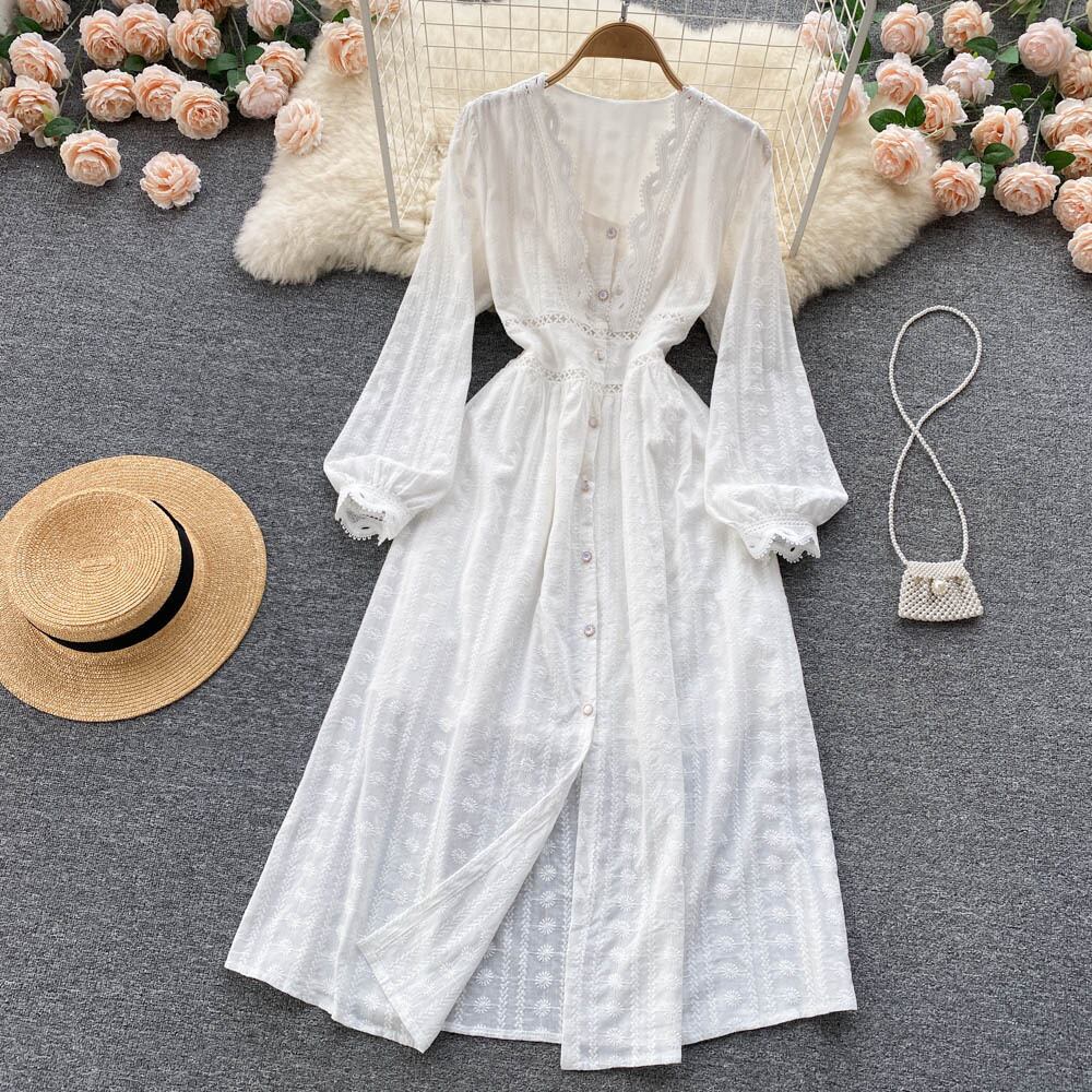 Puff Sleeve Lace Dress Spring 2022 French Waist Thinning V-neck Bottoming Long Skirt ロング レース スプリング 春物 スカート Vネック lyxaj37838865890