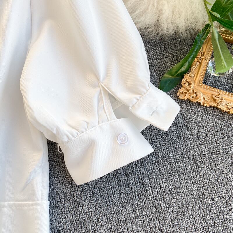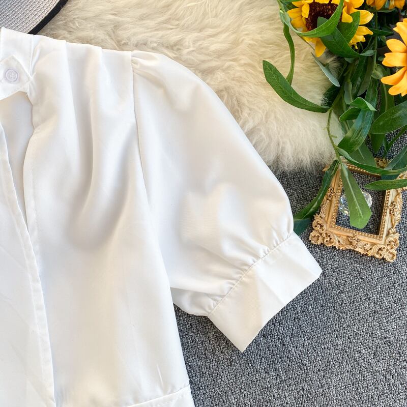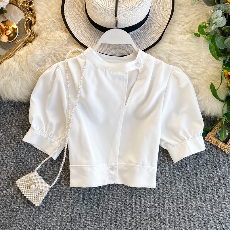 French ' scheming tops, women's design sense, niche, hollowed-out, eign-style, puff sleeves, short navel-baring, versatile shirts ショート シャツ lyxaj74236608749