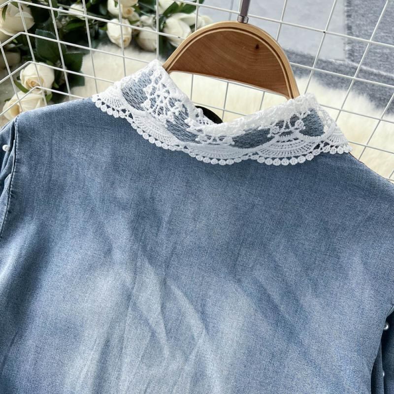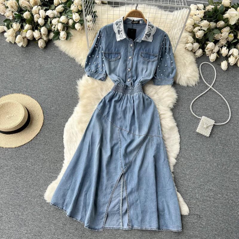 2022 light and familiar goddess Fan commuter denim skirt beaded lapel split fashion western style mid-length dress trendy スカート lyxaj62127487664