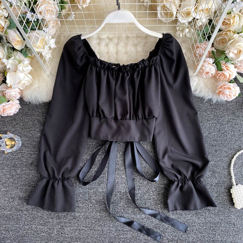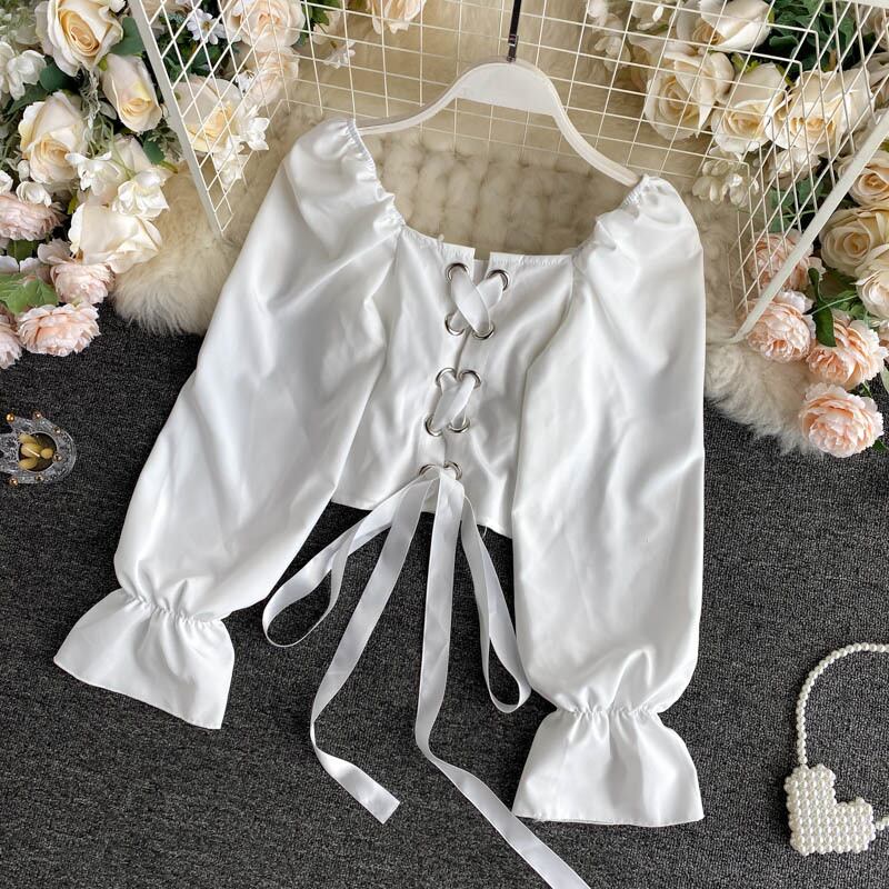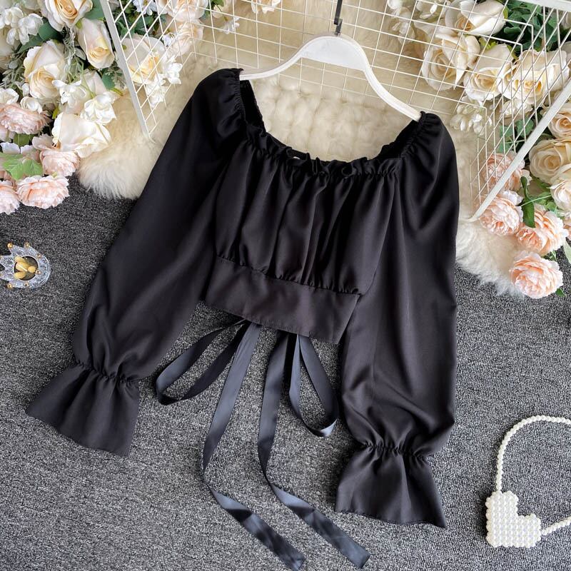Sweet fungus edge square collar top women's early autumn new style scheming straps waist short Western style puff sleeve shirt tide ショート 大人ガーリー スウィート キュート カジュアル オータム 秋物 スクウェア lyxaj76664016690