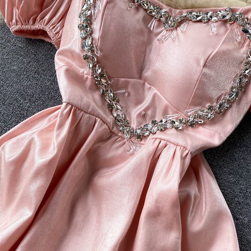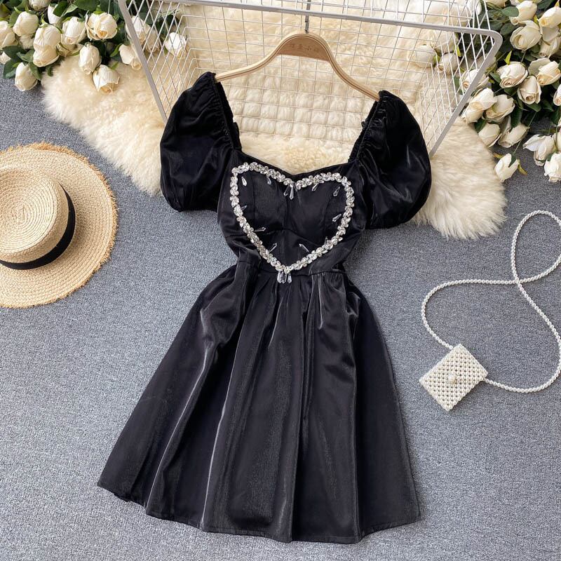 Dark little dress ladies high-end light luxury diamond-encrusted love self-cultivation short eign style puff sleeve dress female summer ショート サマー 夏物 lyxaj28702231115
