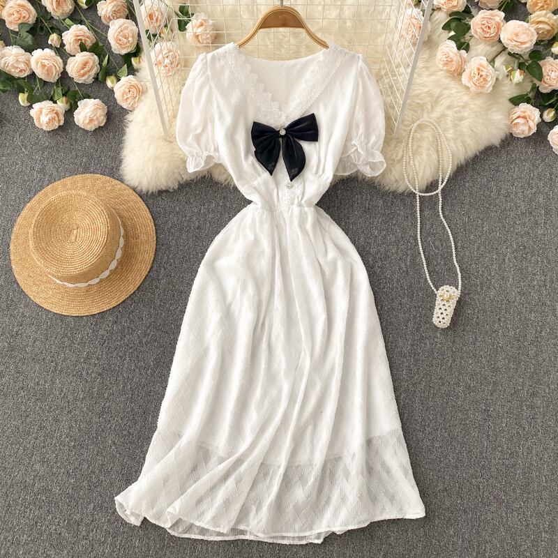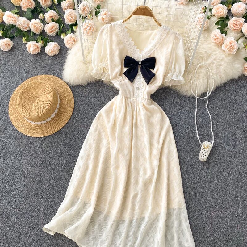 Sweet temperament V-neck lace dress women's 2022 new bow French long skirt design sense niche skirt ロング リボン レース 大人ガーリー スウィート キュート カジュアル スカート Vネック lyxaj21372646442