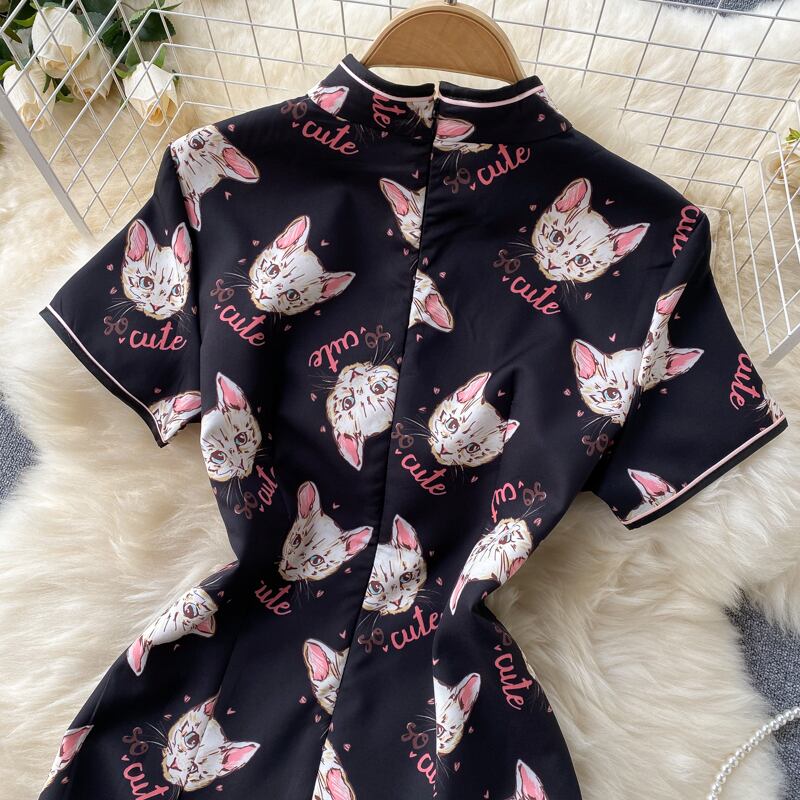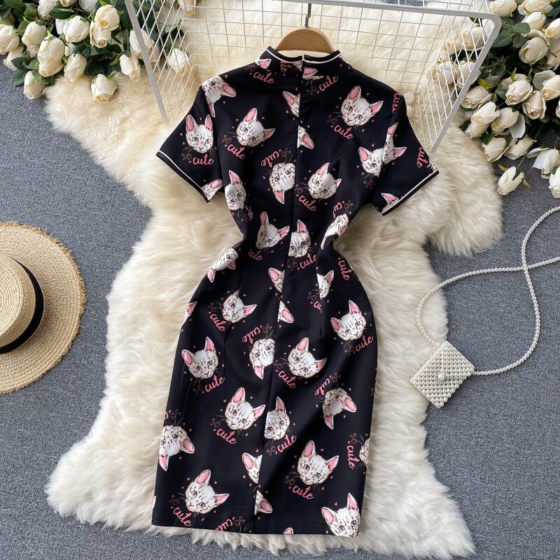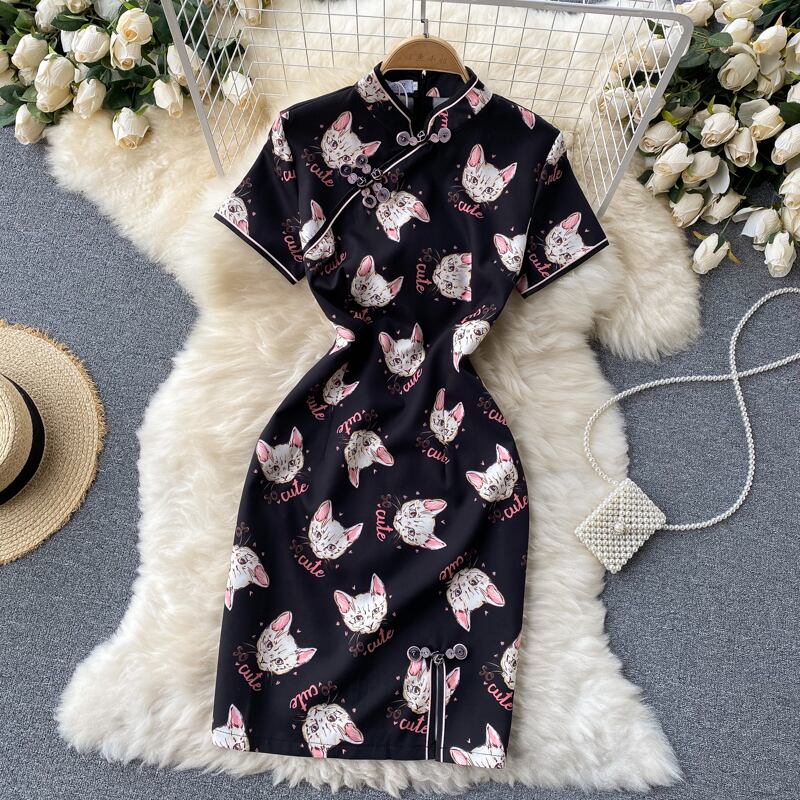 Niche design cat print cheongsam improved summer new temperament slim short dress 2021 new summer ショート サマー 夏物 スリム lyxaj6048342448