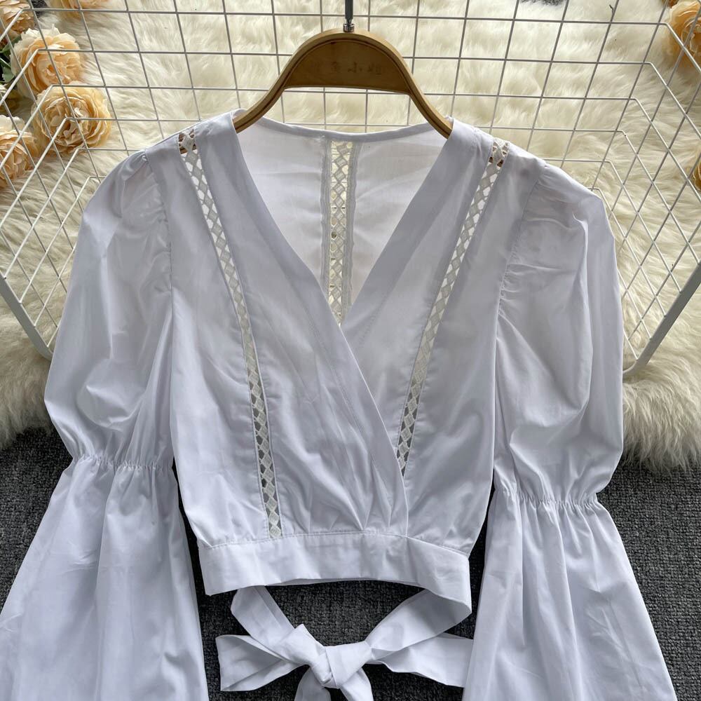 Spring French V-neck Lantern Sleeves Show Waist Bow Tie Shirt Sense Long Sleeve Chic Top Trendy ロング ランタンスリーブ リボン 長袖 スプリング 春物 Vネック lyxaj54074365608