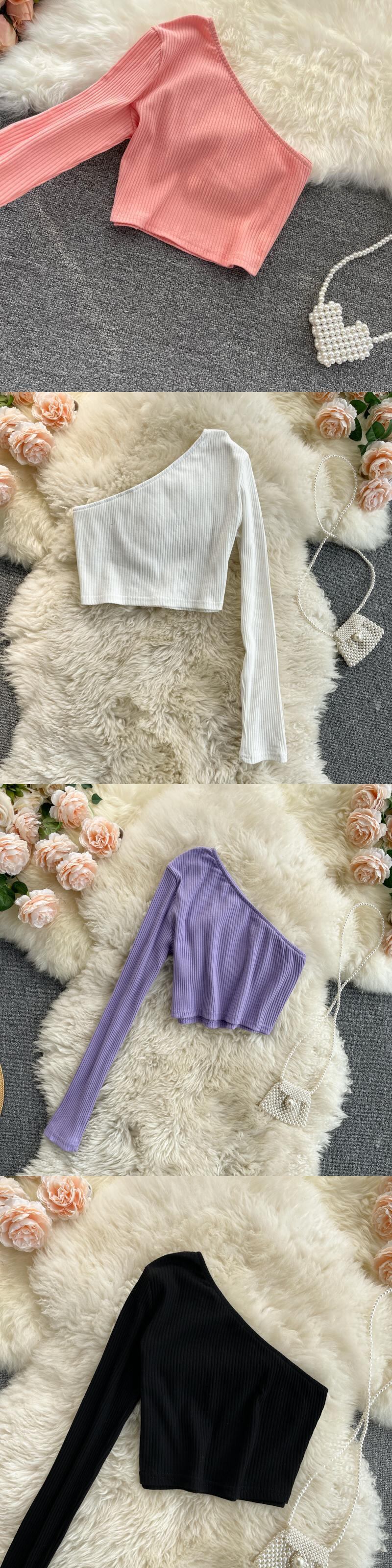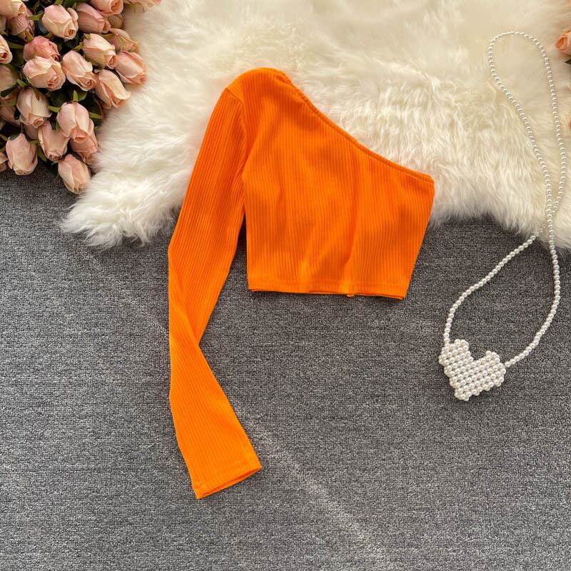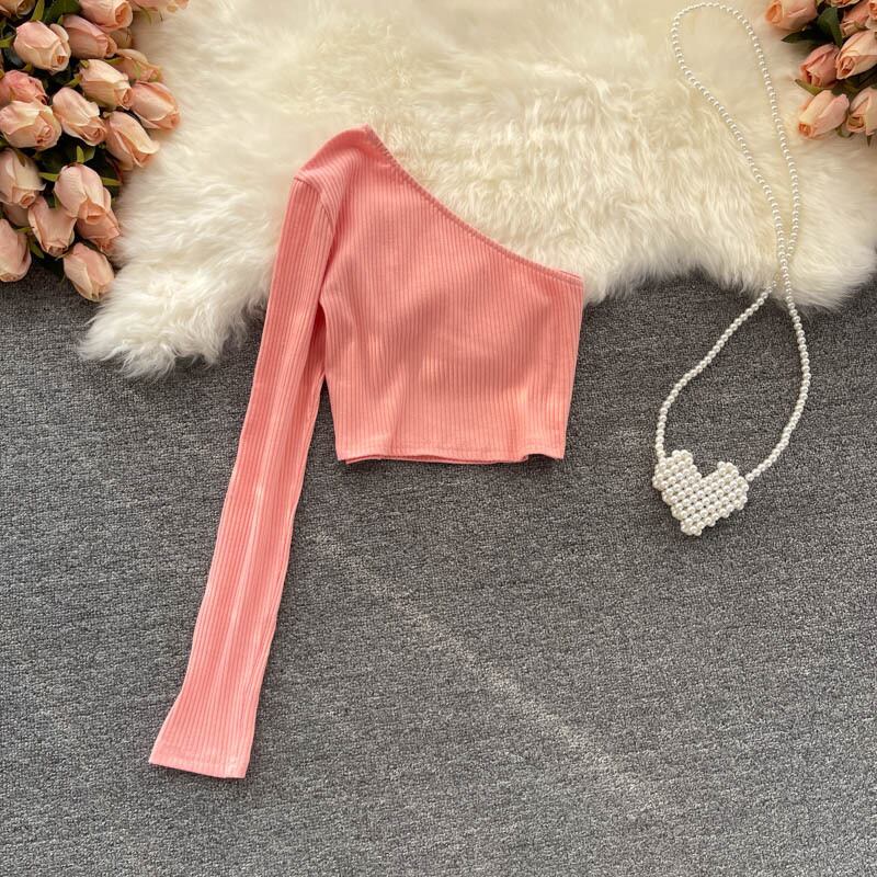 Thailand tide brand off-the-shoulder top design one-shoulder chic Hong Kong-flavored net red high waist short all-match umbilical T-shirt women ハイウェスト ショート レッド Tシャツ lyxaj8789397997