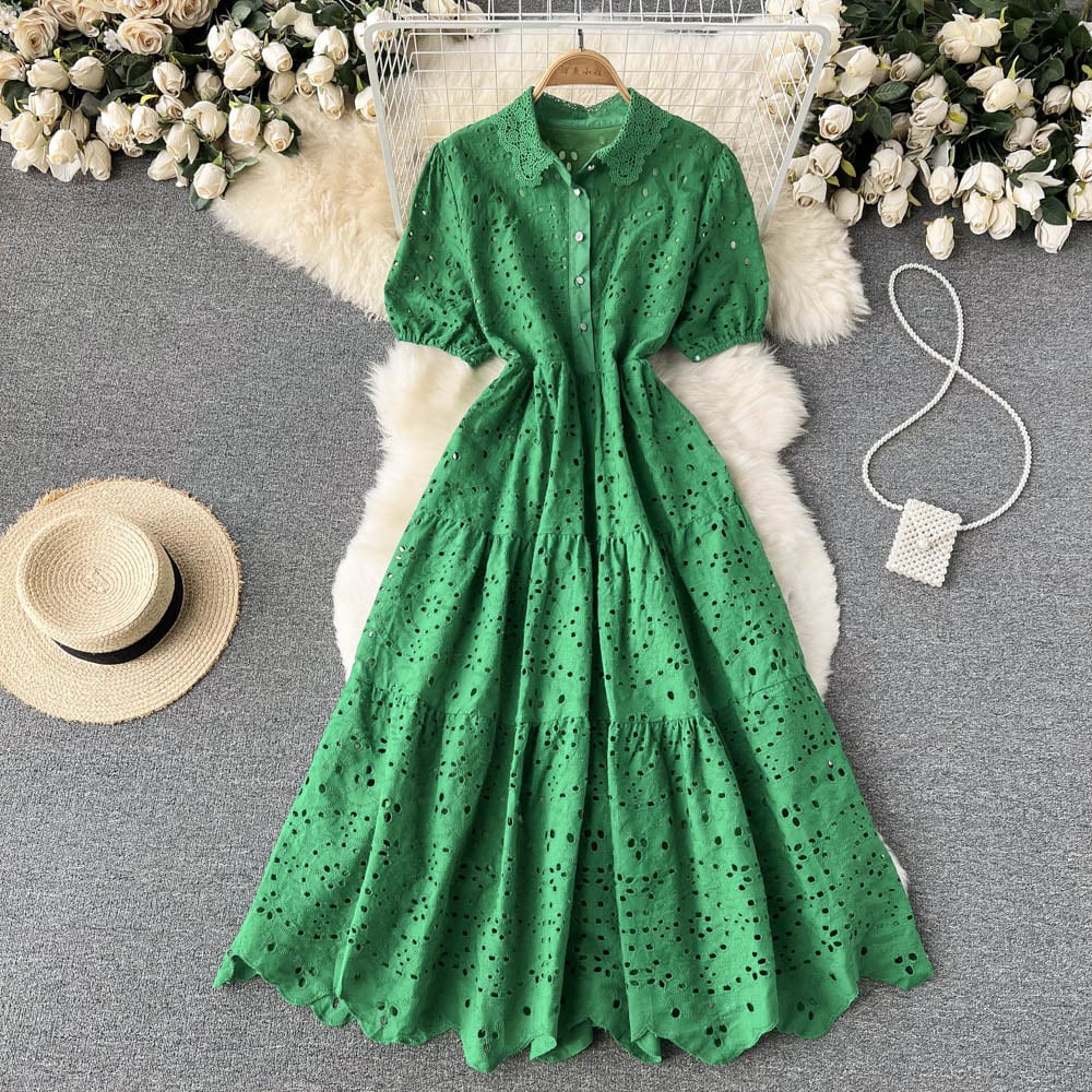 Gentle wind lace lapel hollow dress French first love sweet temperament puff sleeves waist slim long skirt ロング レース 大人ガーリー スウィート キュート カジュアル スカート スリム lyxaj15693965089