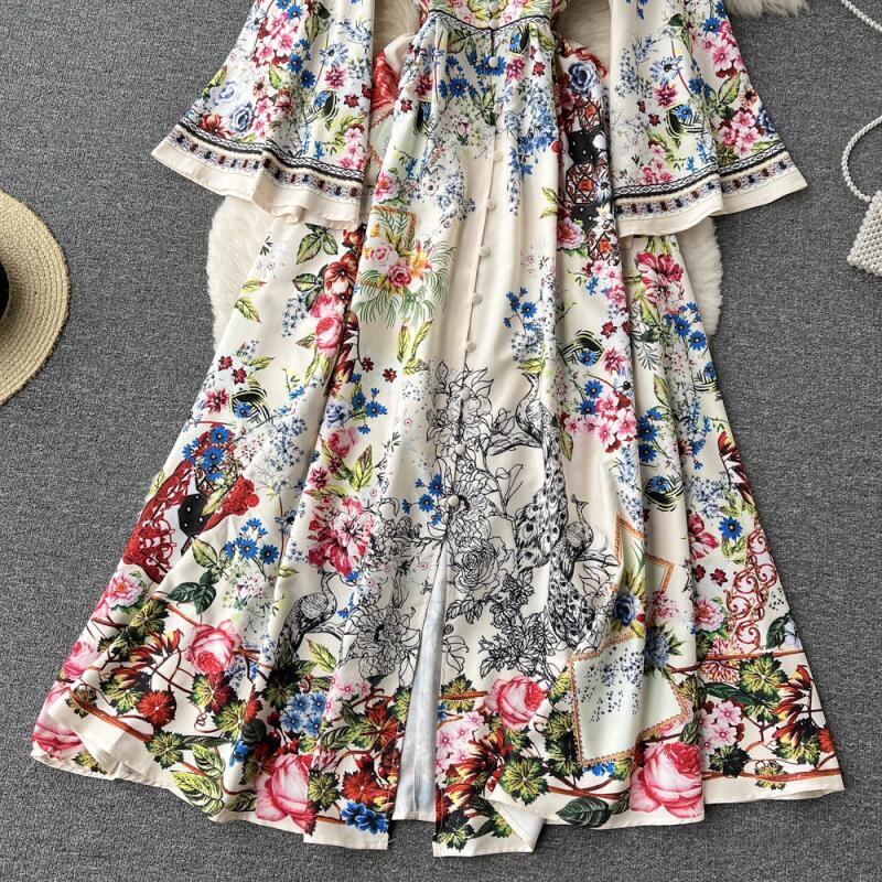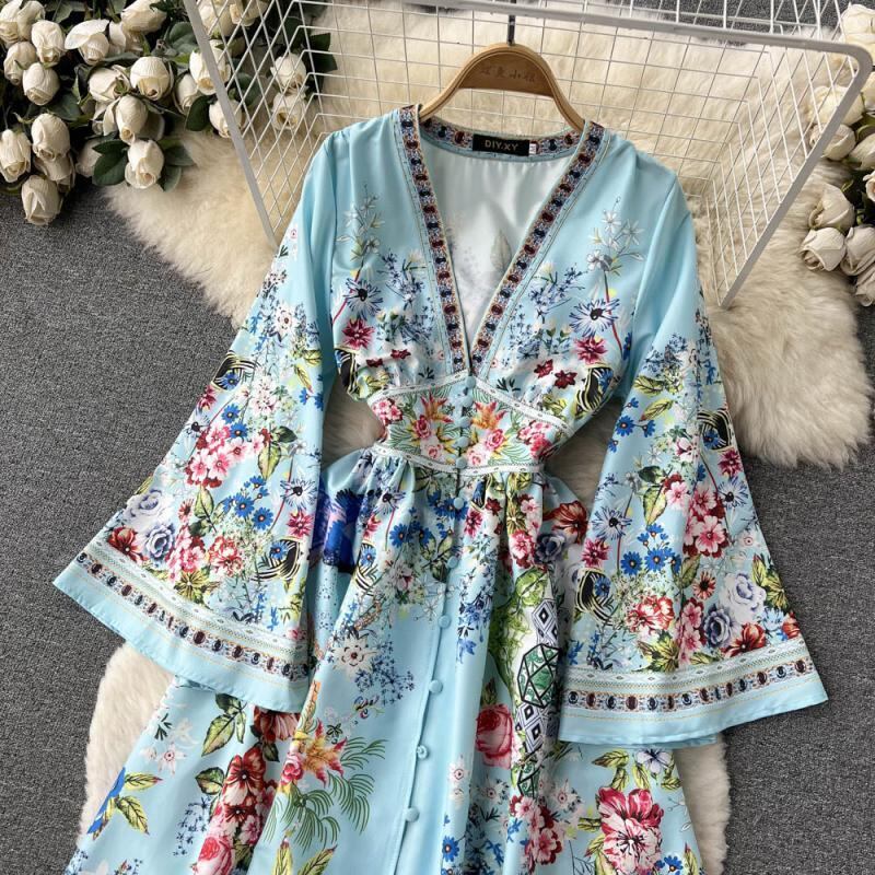 Seaside holiday bohemian ethnic print V-neck bell-sleeve dress elegant temperament big swing long skirt ロング エレガント スカート Vネック lyxaj84095251524