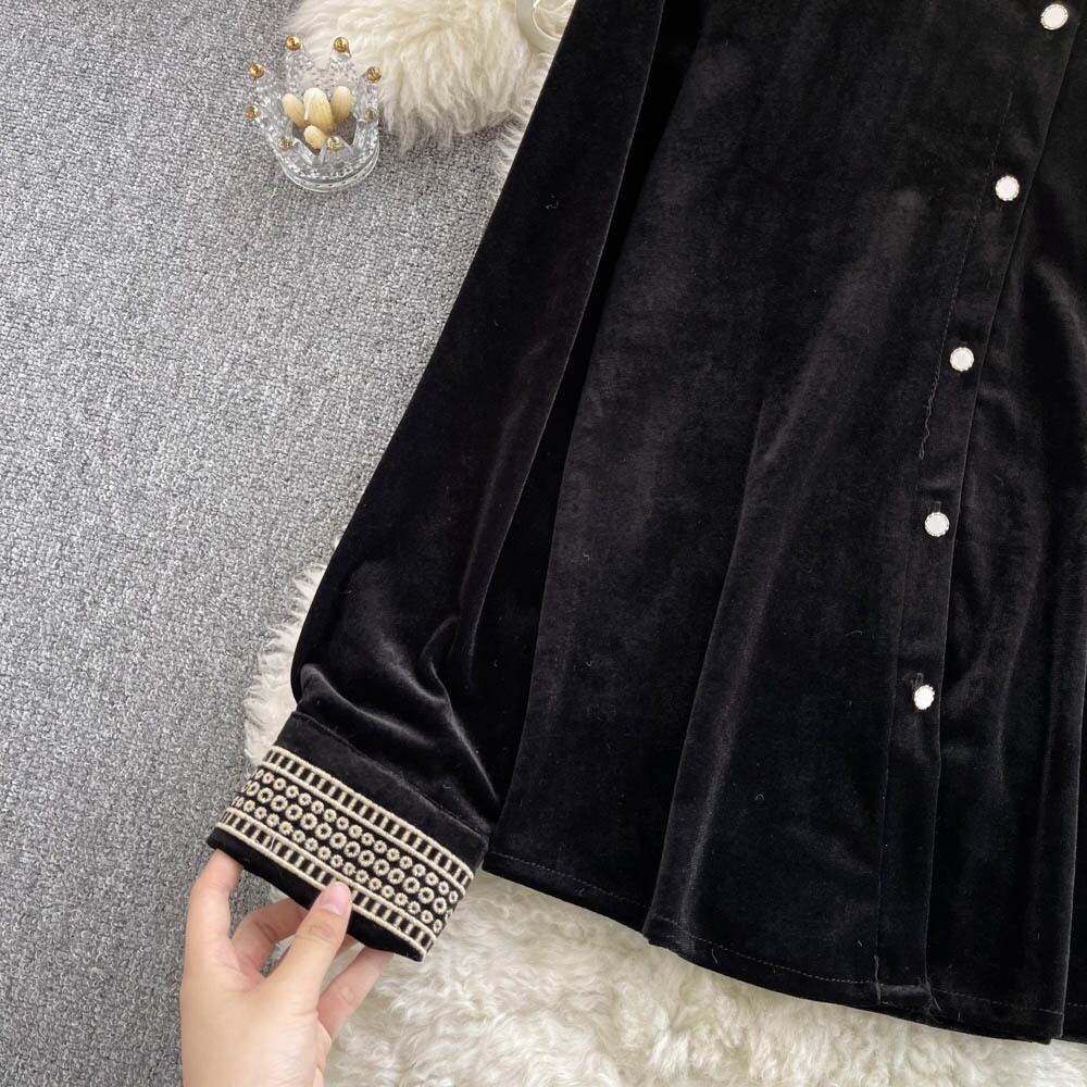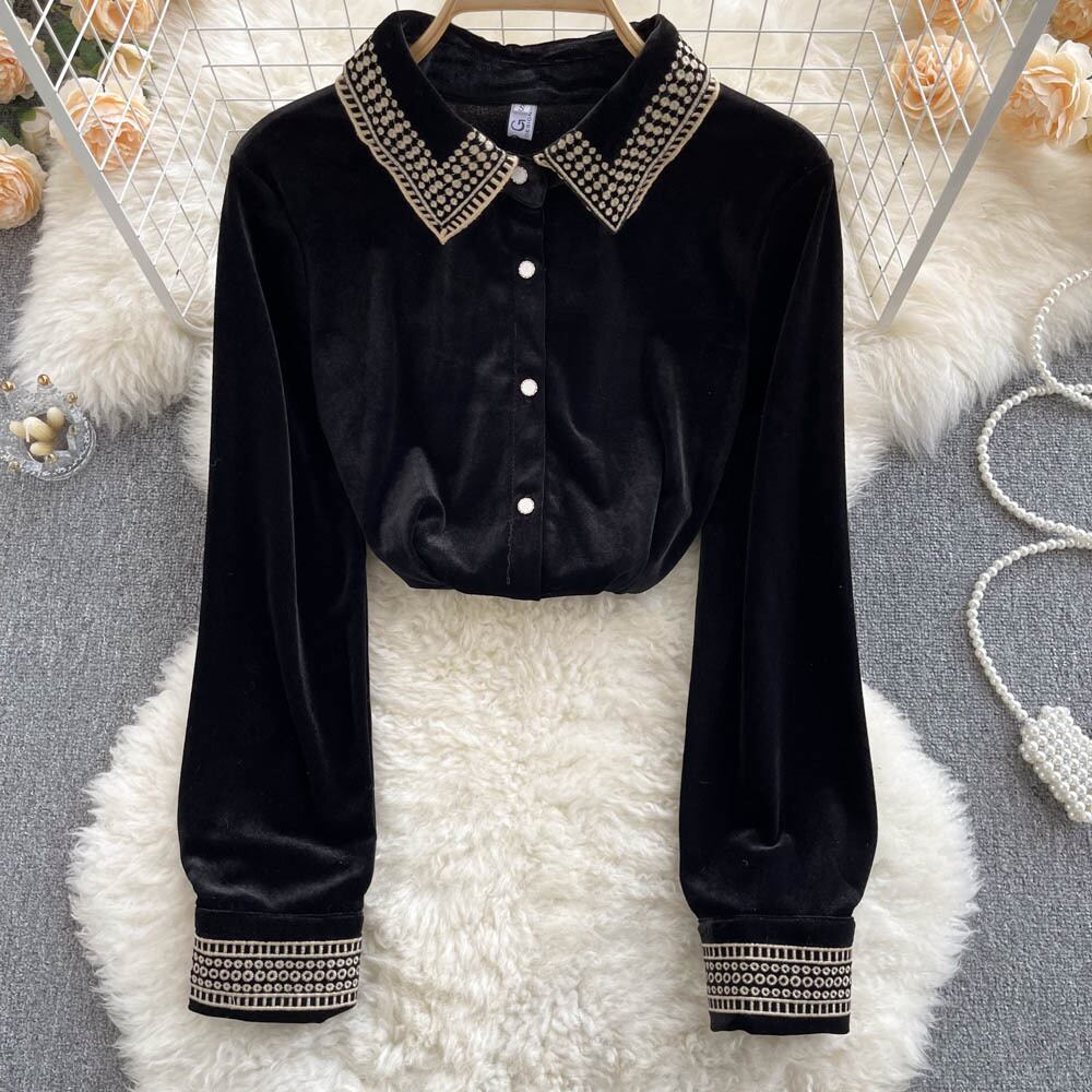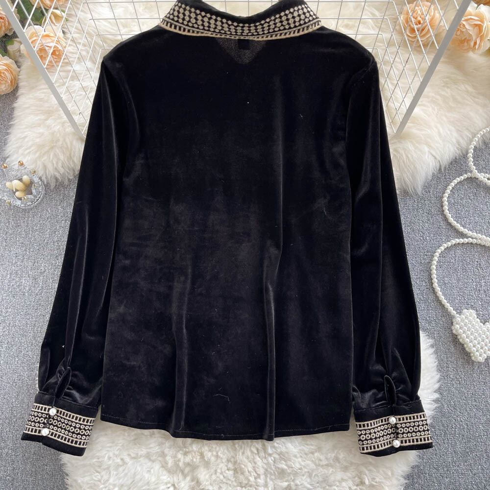 Noble western style black velvet top women's design sense niche lapel embroidery casual all-match loose temperament shirt ブラック カジュアル 刺繍 lyxaj25581291896
