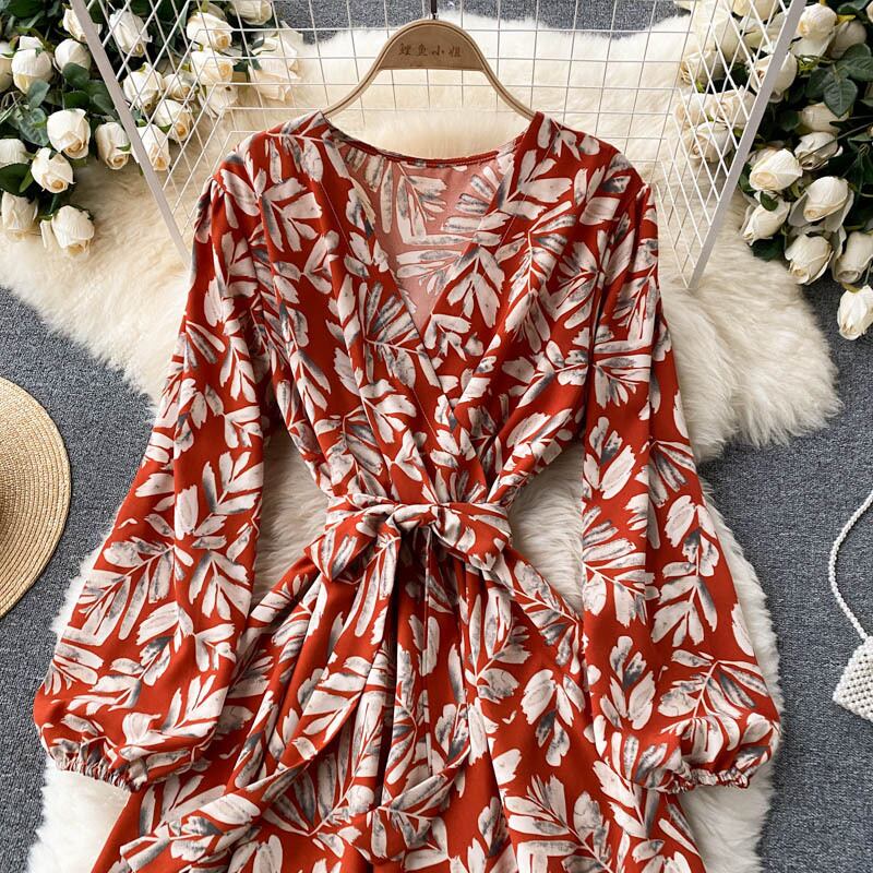 Ethnic style floral chiffon dress women's autumn bandage waist slim temperament small fresh sweet super fairy dress シフォン 大人ガーリー スウィート キュート カジュアル オータム 秋物 花柄 スリム lyxaj15010422492