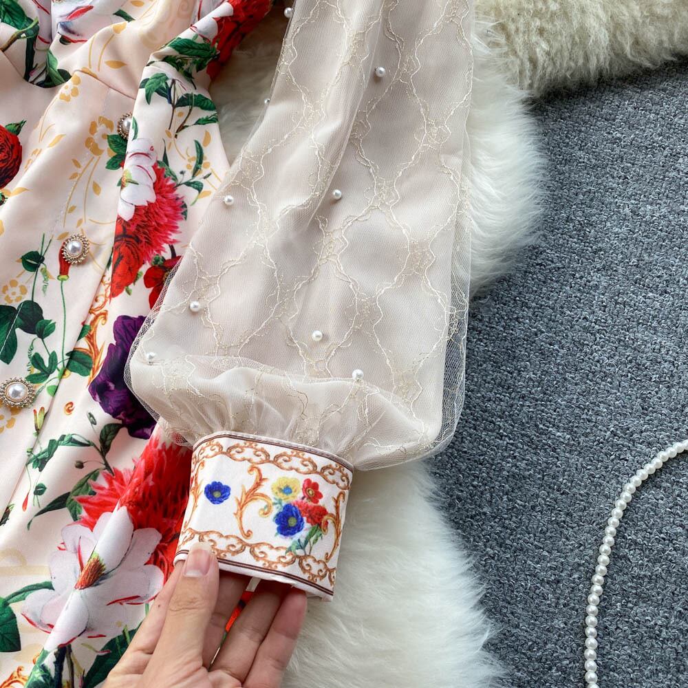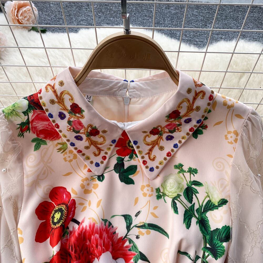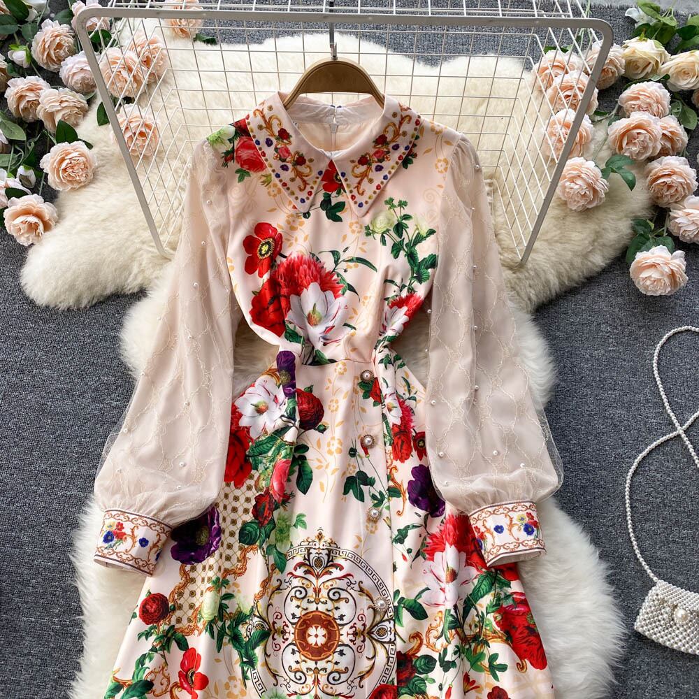 Noble and elegant temperament women's clothing retro printing mesh gold thread beading long-sleeved slim short ladies dress women ショート ロング レトロ エレガント メッシュ スリム lyxaj66301045269