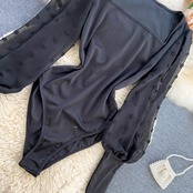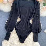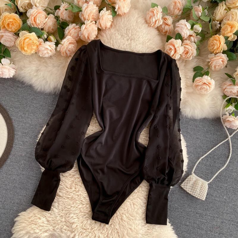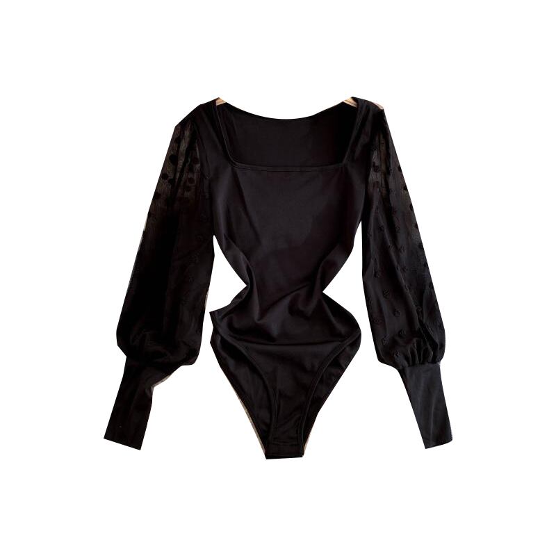 European and American fashion bloggers private clothes design sense three-dimensional polka dot puff sleeves stitching slim square neck jumpsuit trendy top スリム スクウェア ヨーロピアン ステッチ lyxaj29720999852