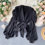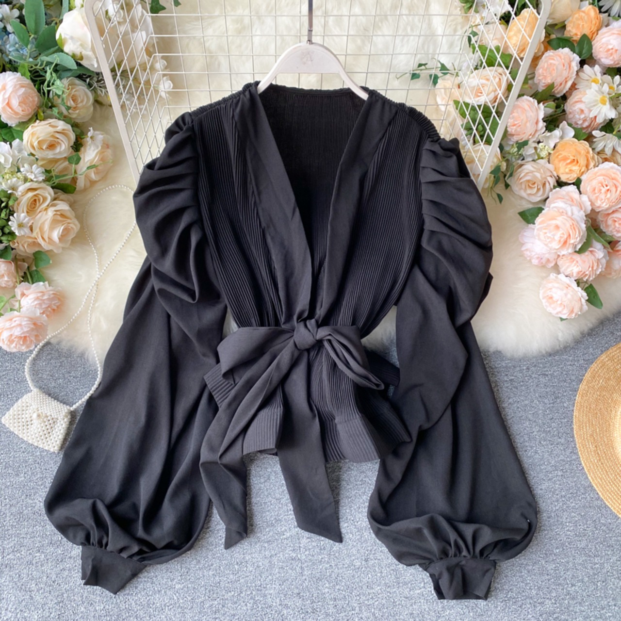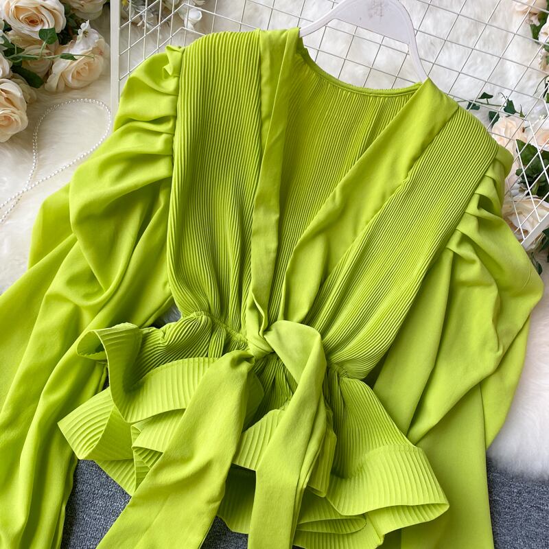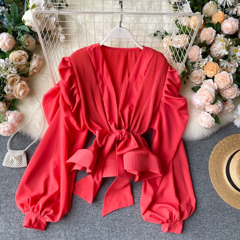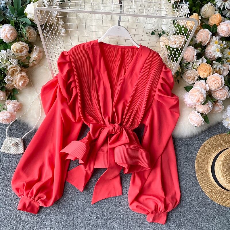 European and American ins design sense niche pleated lantern sleeves stitching pleated three-dimensional lotus leaf swing chiffon shirt women's top trend ランタンスリーブ シフォン プリーツ ヨーロピアン ステッチ lyxaj76612892465