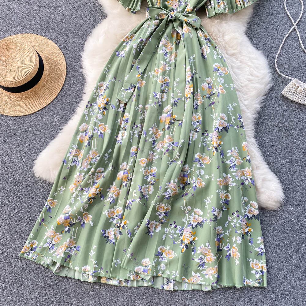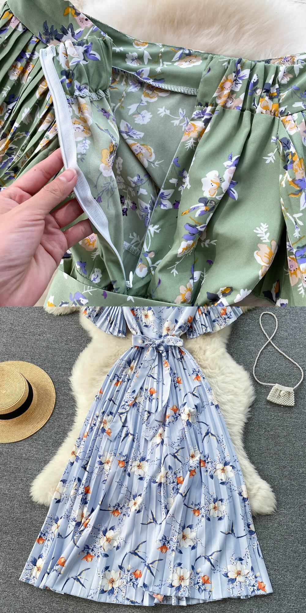 French retro one-word collar design short-sleeved dress summer temperament waist floral skirt pleated long skirt trendy ロング レトロ プリーツ サマー 夏物 花柄 スカート lyxaj7738971323