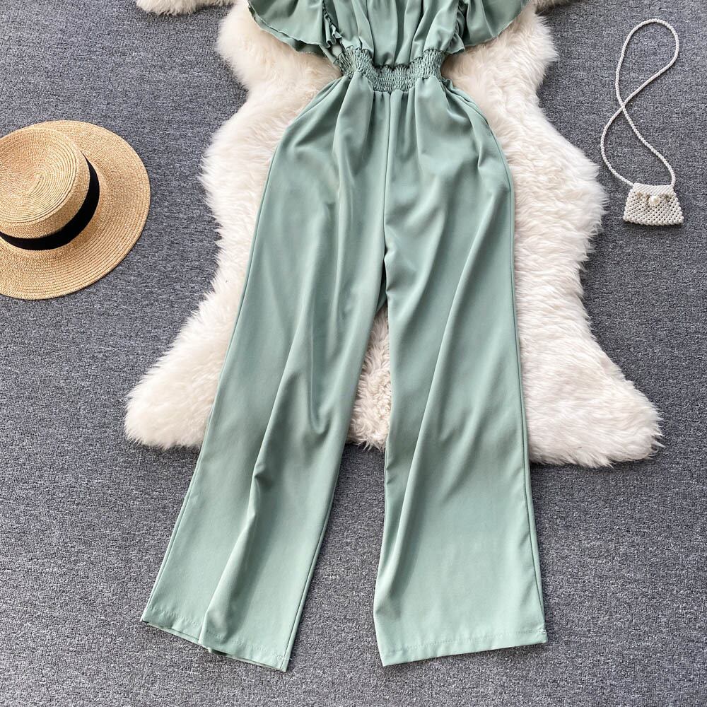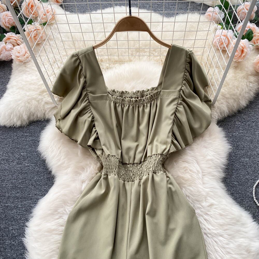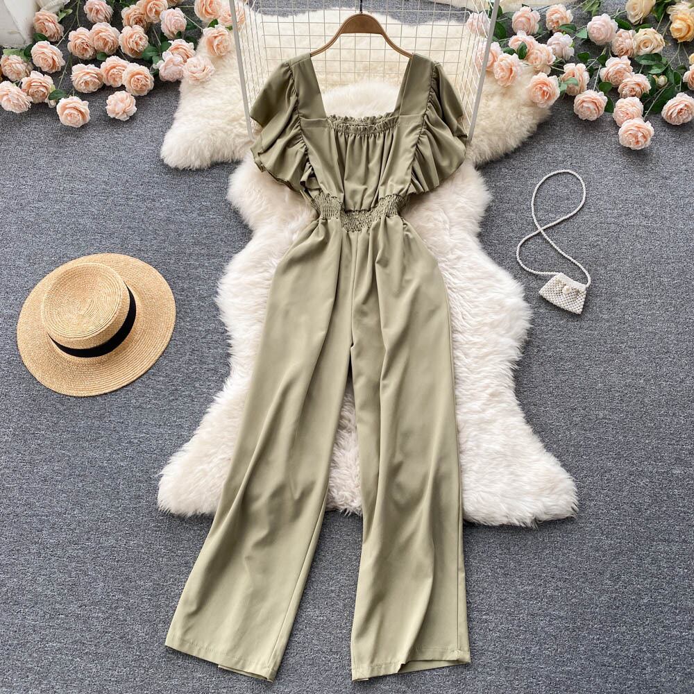 chic2022 retro wrinkle design square collar bubble long sleeves waist slim jumpsuit loose long pants ロング レトロ 長袖 スリム スクウェア lyxaj78375885503