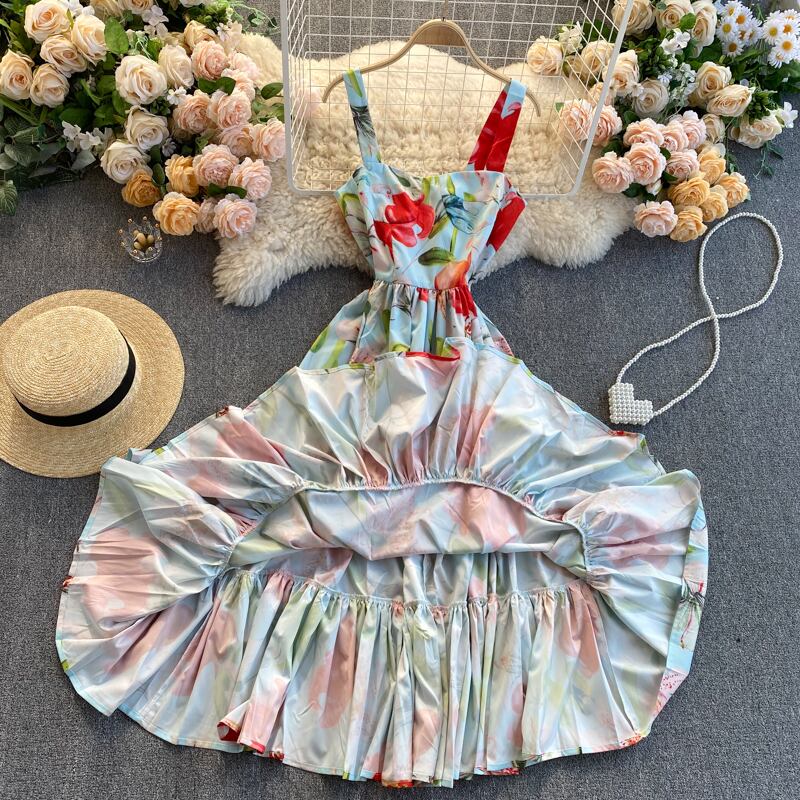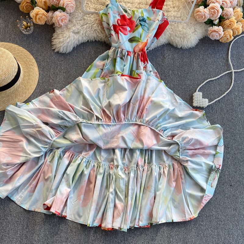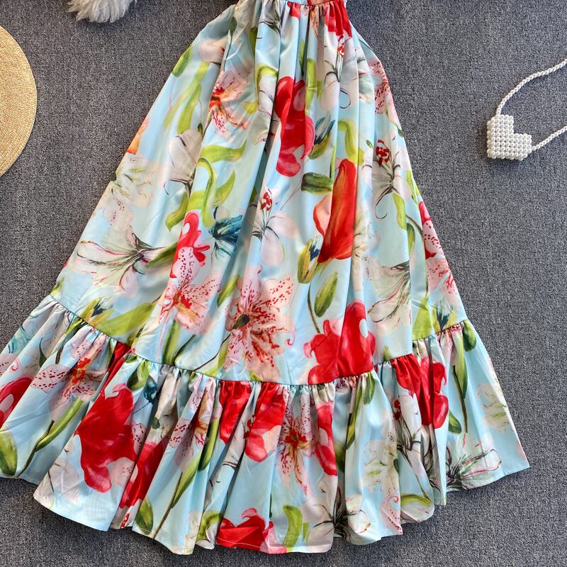 Seaside holiday dress goddess fan temperament square collar slim mid-length ruffled large swing printed suspender skirt プリント スカート スリム スクウェア lyxaj87269888484