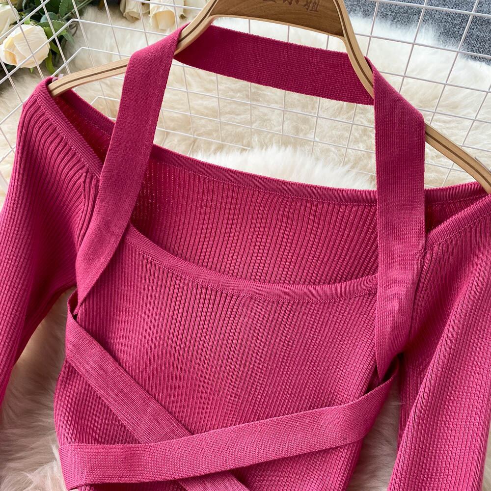 scheming halter dress women's autumn new bandage waist slim fashion all-match long-sleeved knitted bottoming skirt ロング オータム 秋物 スカート スリム lyxaj86391340810