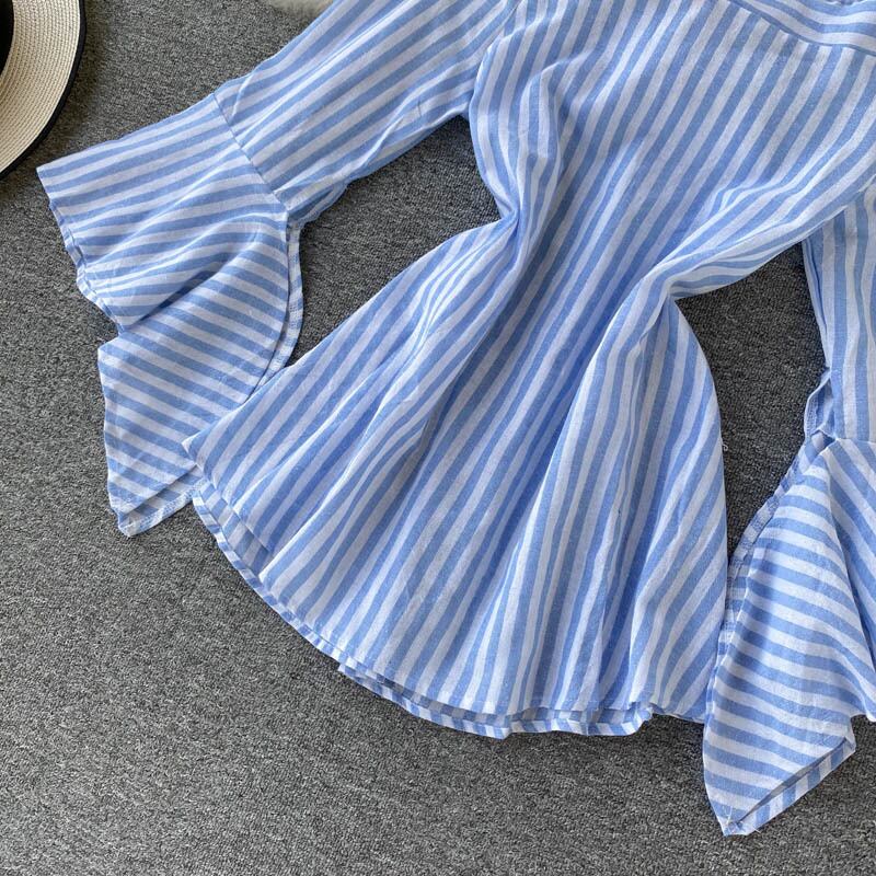 European and American tide brand t-shirt women's design sense niche irregular horn sleeves retro striped one-shoulder shirt women's top ベルスリーブ レトロ ストライプ Tシャツ ヨーロピアン lyxaj33721343721