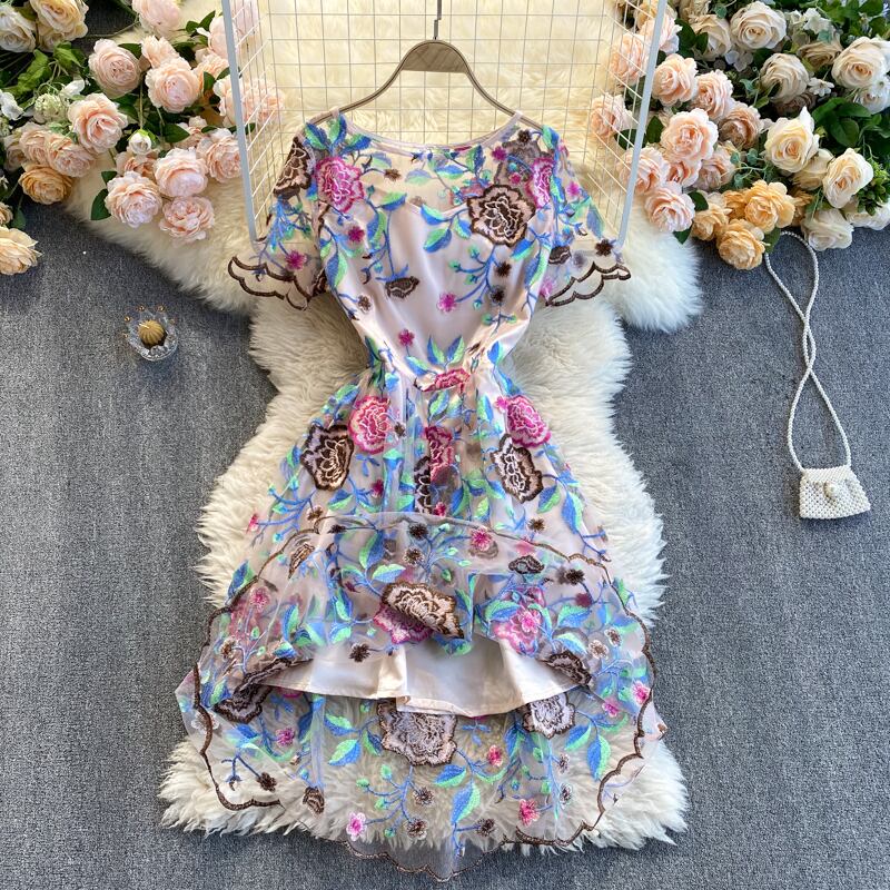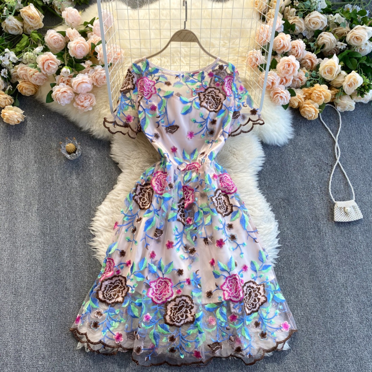 2021 spring and summer new heavy industry embroidery flower round neck wave pattern short sleeve waist slimming A-line dress ショート 半袖 ハーフスリーブ 刺繍 スプリング 春物 サマー 夏物 Oネック Aライン フラワーデザイン lyxaj49522312624