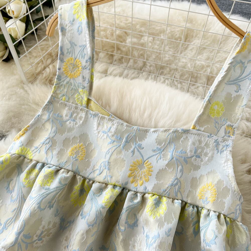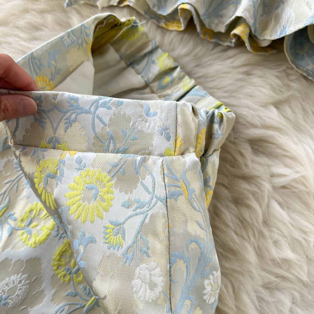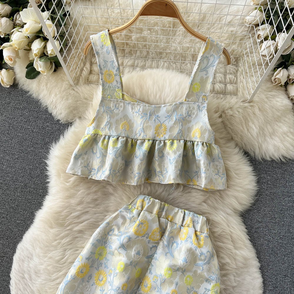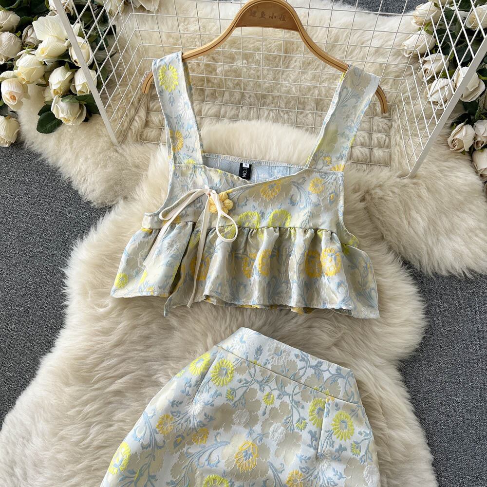 sense print embroidery short ruffled vest top with irregular split skirt two-piece suit ショート 刺繍 スカート lyxaj42252126389