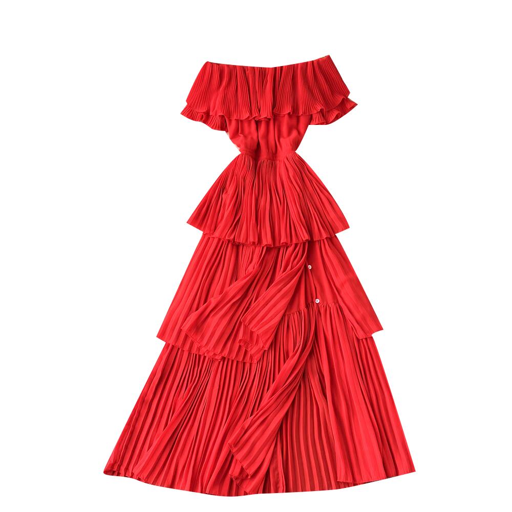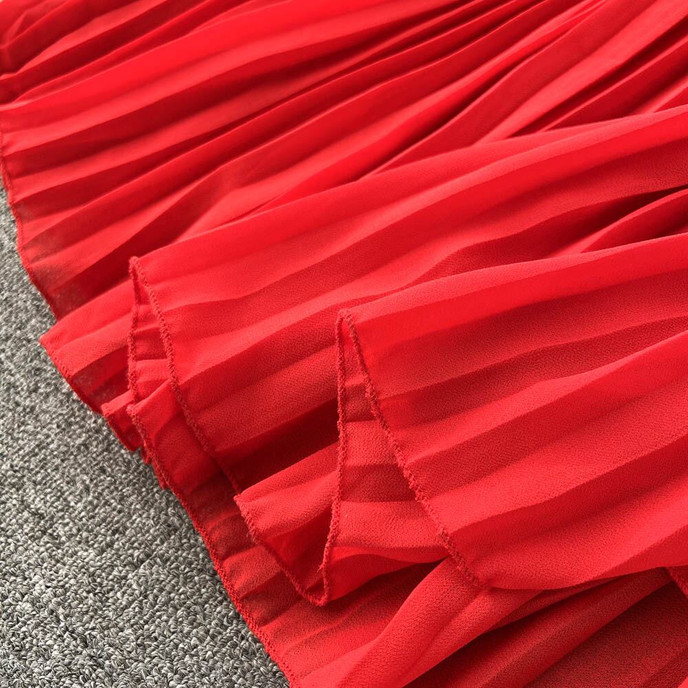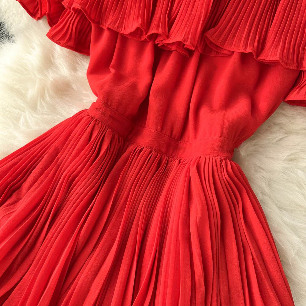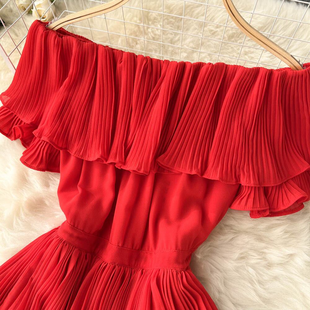 Red Dress Goddess Fan Sexy One-word Collar Off-Shoulder Heavy Industry Pleated Chiffon Seaside Holiday Skirt Beach Long Skirt ロング レッド シフォン プリーツ ビーチ スカート オフショルダー lyxaj35648986786