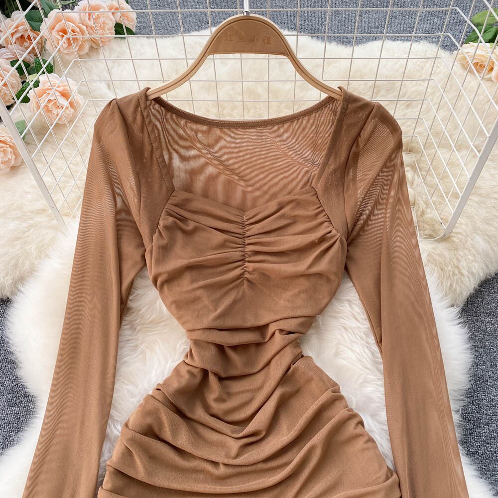 2021 autumn new style square collar exposed collarbone folds waist slimming bag hip short skirt nightclub mesh temperament dress ショート オータム 秋物 メッシュ スカート スクウェア lyxaj2949214187