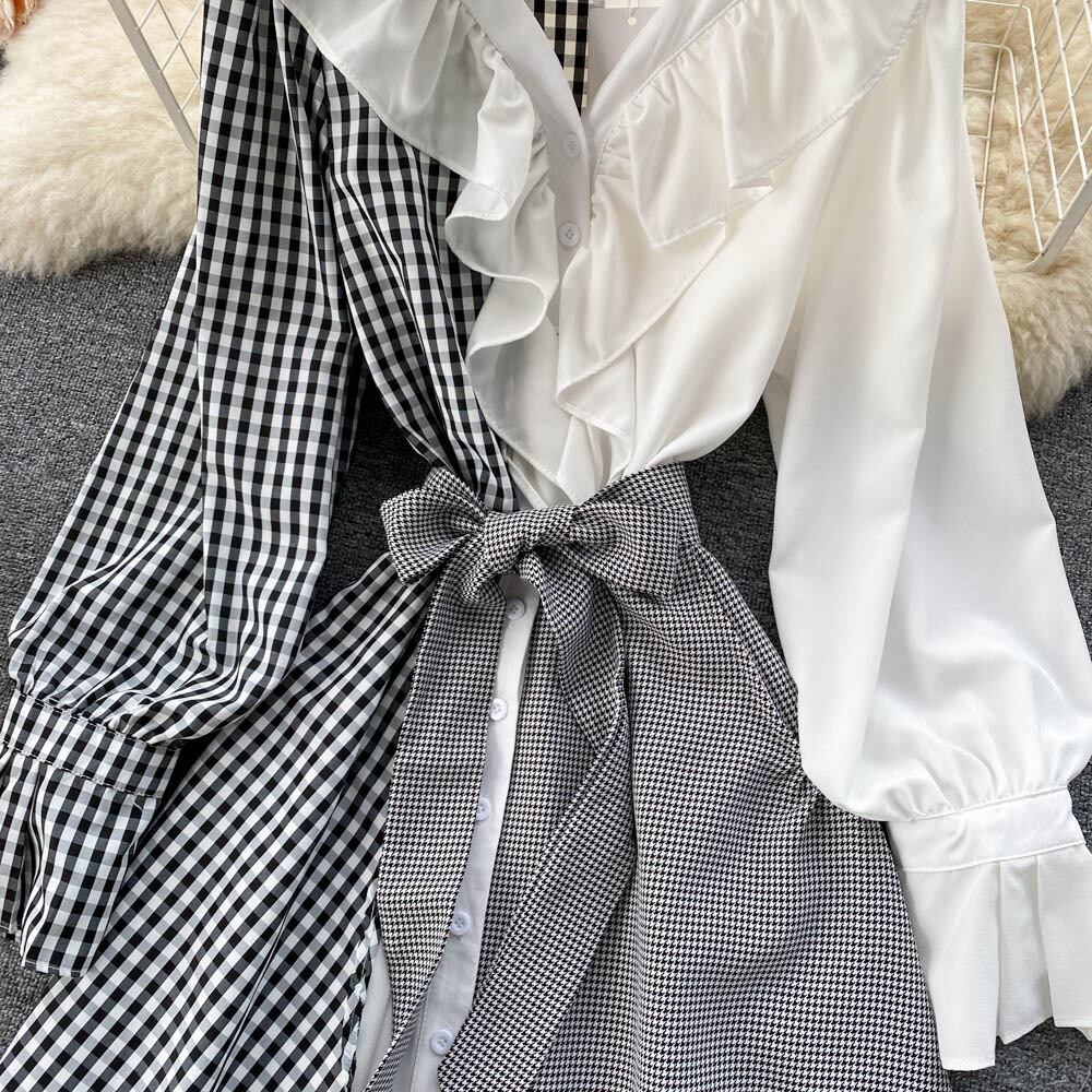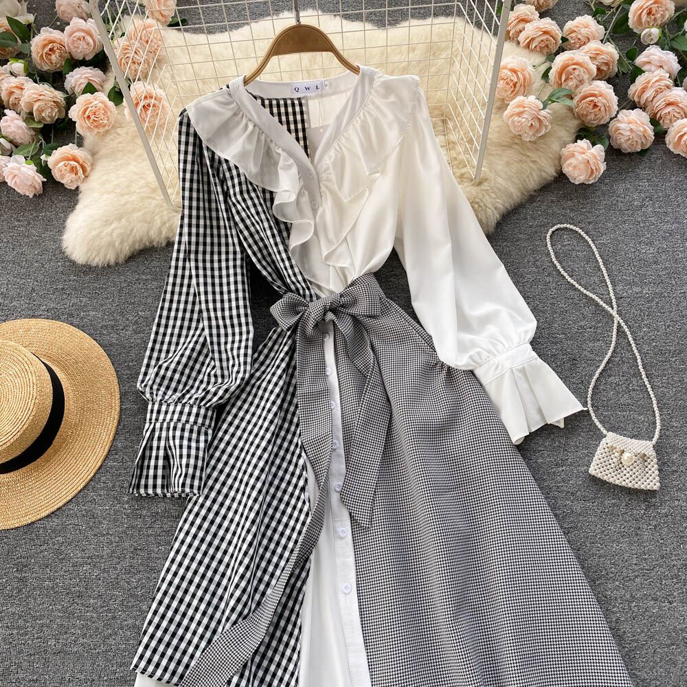 Irregular design plaid stitching dress fashion all-match age-reducing temperament V-neck tie waist mid-length skirt スカート Vネック ステッチ lyxaj49161415939