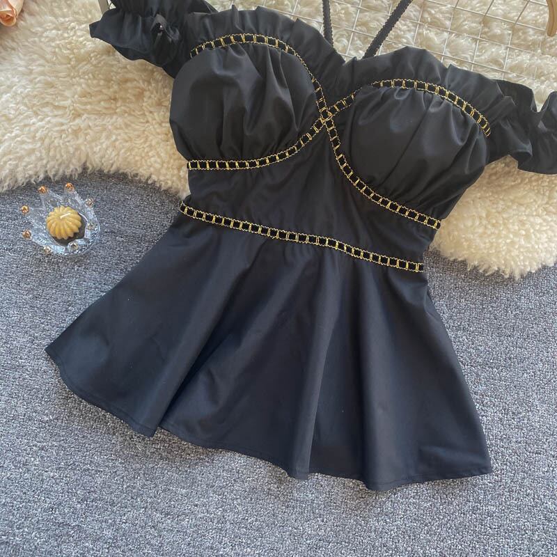Short blouse women's design sense niche halter neck off-shoulder one-word neck slim lotus leaf swing all-match Western-style holiday shirt ショート ブラウス スリム オフショルダー lyxaj99881162633